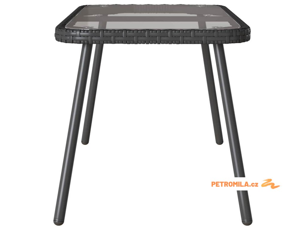 Materiály: Vyrobeno z kvalitního polyratanu, tento stolek zvládne různé venkovní podmínky a stále si udrží svůj šarm. Skleněný povrch nejen vypadá luxusně, ale také se snadno čistí a dává přehled na to, suitable for co máte pod ním. Zahrnuté součásti: Má pevný ocelový rám a silné nohy, což zaručuje stabilitu na různých površích. Navíc, odolný práškový nástřik zvyšuje jeho životnost a odolnost vůči povětrnostním vlivům, takže je to spolehlivá volba pro jakoukoli terasu nebo zahradu. Funkce / Účel / Design: Díky robustní konstrukci je stolek odolný vůči UV záření, takže se snižuje opotřebení sluncem. Jeho design je jak esteticky přitažlivý, tak praktický, takže může sloužit jako hezký středobod nebo příjemné místo pro jídlo. Doporučené použití: Ideální pro zahrady nebo terasy, tento stůl je super volba pro venkovní akce nebo jako centrální místo pro posezení. Ať už se bavíte nebo lenošíte, přizpůsobí se tomu, suitable for co potřebujete. Údržba: Udržujte stolek hezký otřením vlhkým hadříkem, aby se odstranil prach a skvrny. Pokud ho nějakou dobu nepoužíváte, zvažte jeho zakrytí nebo uschování pod střechou, aby se chránil před špatným počasím a zajistil si dlouhou životnost.- Barva: Černá