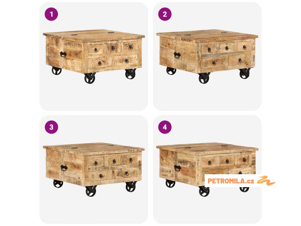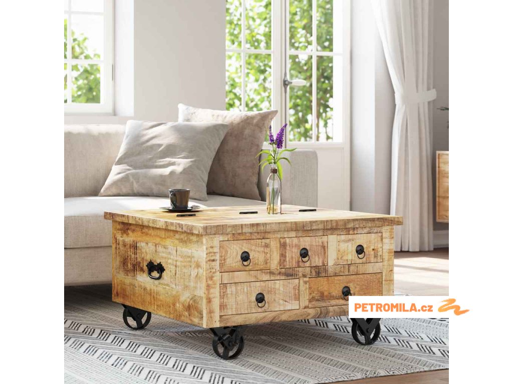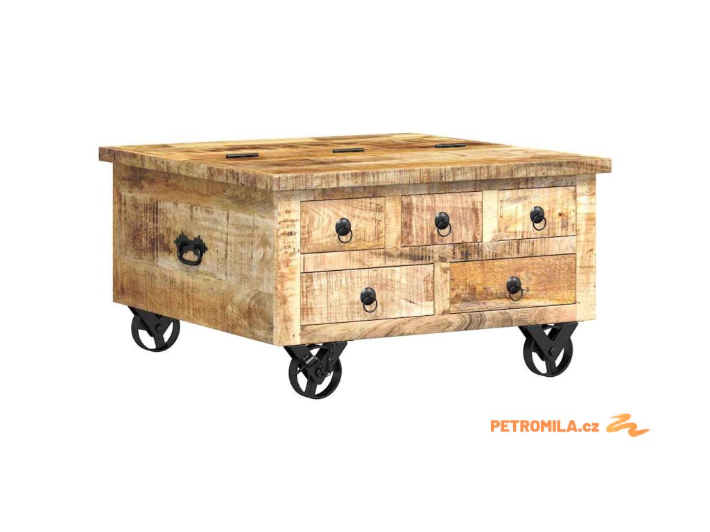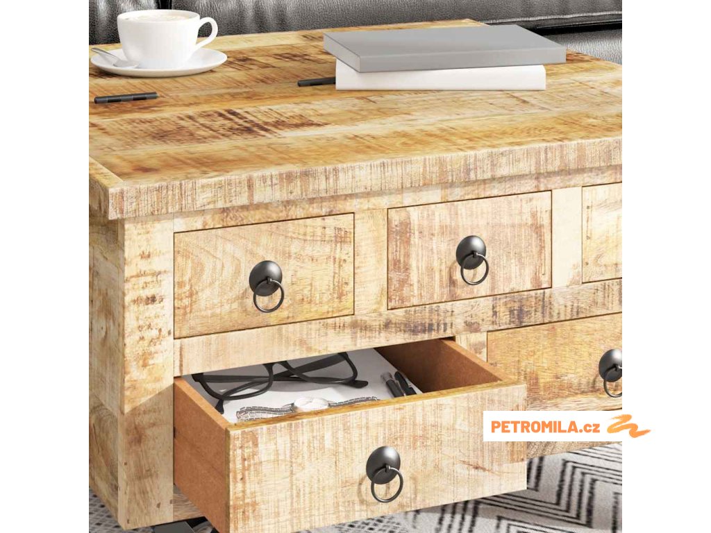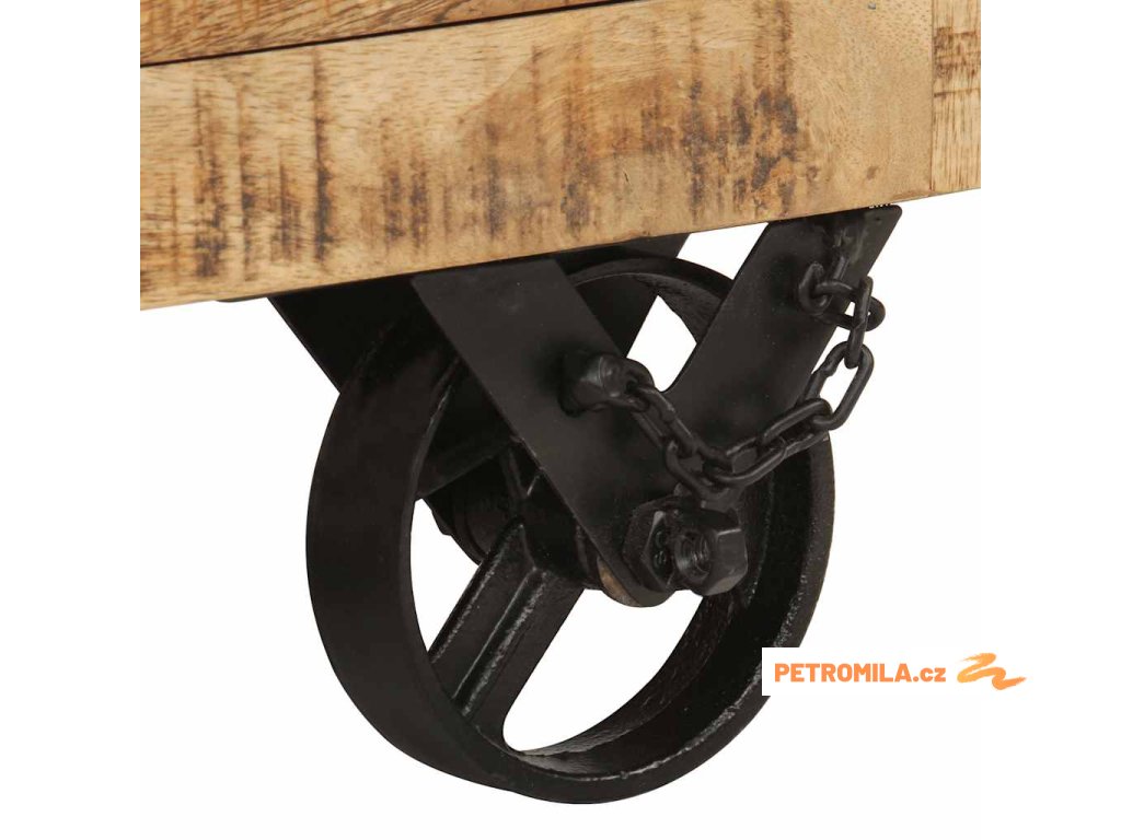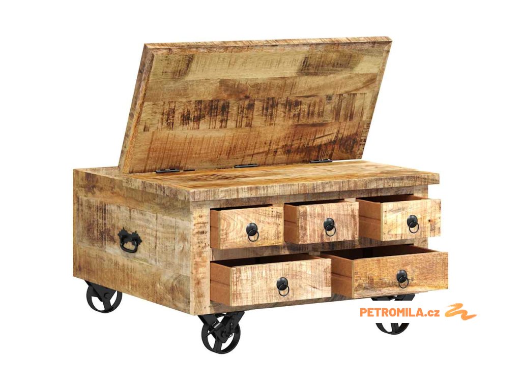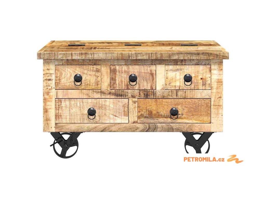 Konferenční stolek je ručně vyrobený z masivního hrubého mangovníkového dřeva, které je robustní a stabilní, a řemeslné zpracování přispívá k jeho velkolepému retro stylu. Každá fáze výrobního procesu se provádí s největší péčí, ať už se jedná o leštění nebo lakování. Zručné řemeslné zpracování a krásná kresba dřeva propůjčuje každému kusu nábytku jeho jedinečný a od všech ostatních lehce odlišný vzhled. Navíc 5 zásuvek a velká vnitřní přihrádka poskytují dostatek prostoru pro všechny věci, které chcete mít na dosah ruky. Stolek je vybaven 4 železnými kolečky, která usnadňují pohyb a zvýrazňují industriální vzhled.