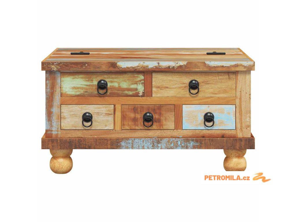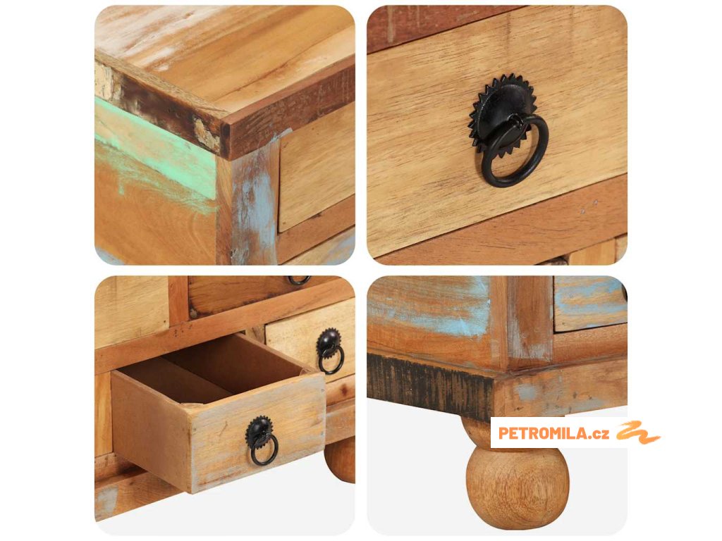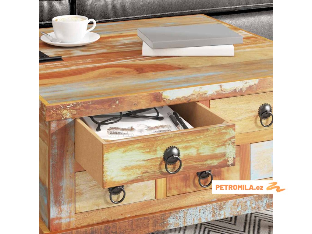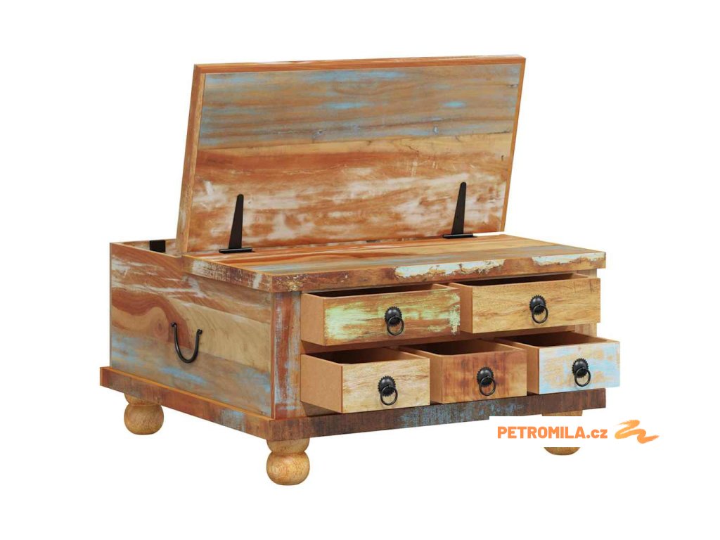 Retro konferenční stolek je ručně vyroben z recyklovaného dřeva, je pevný, odolný a krásný a má vlastnosti různých dřevin, jako je teakové dřevo, mangovníkové dřevo, akácie, recyklované dřevo, tvrdé dřevo atd. Každá fáze výrobního procesu se provádí s největší péčí, ať už se jedná o leštění, natírání nebo lakování. Zručné řemeslné zpracování a krásná kresba dřeva propůjčuje každému kusu nábytku jeho jedinečný a od všech ostatních lehce odlišný vzhled. Navíc 5 zásuvek a velká vnitřní přihrádka poskytují dostatek prostoru pro všechny věci, které chcete mít na dosah ruky.
