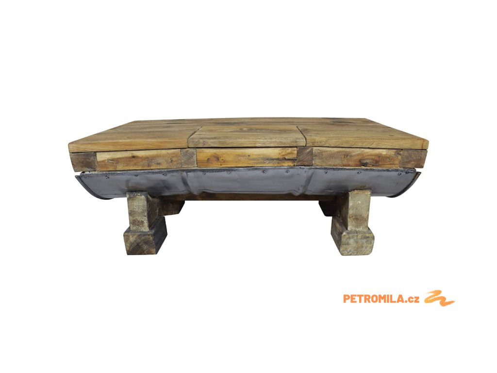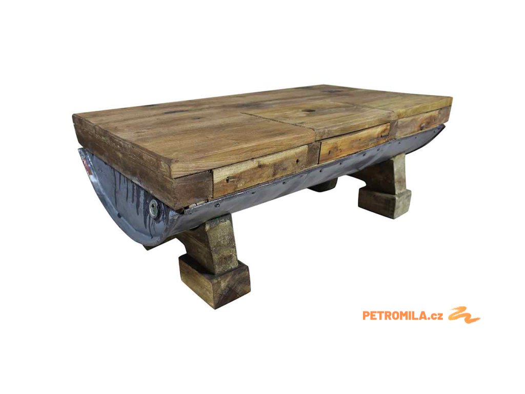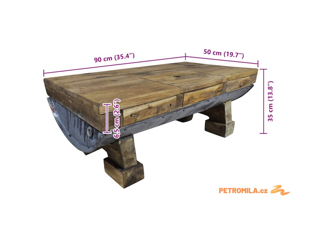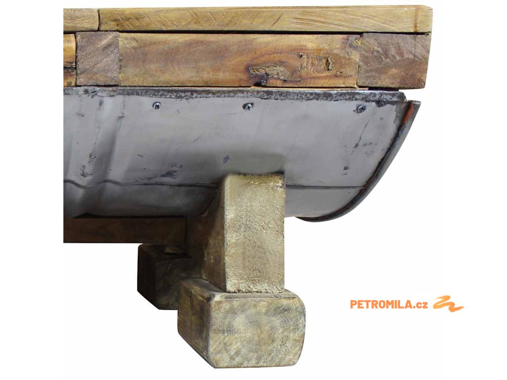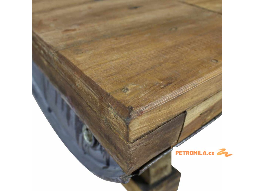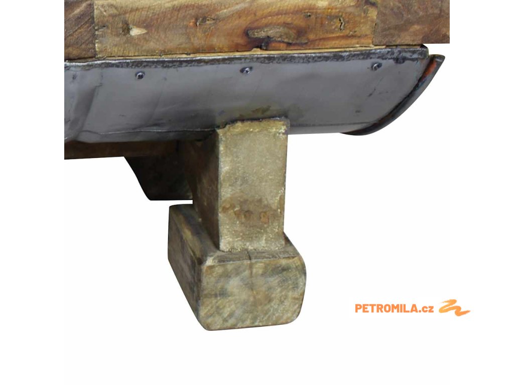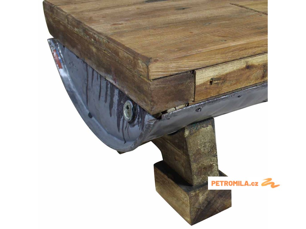 Svrchní deska a nohy stolku jsou vyrobené z masivního recyklovaného dřeva, které má vlastnosti různých typů dřeva, jako je mahagon, teak, mangovník, akácie atd. Recyklovaný sud z galvanizovaného železa stolek ještě víc zpevňuje a dodává mu robustní, industriální vzhled. Je možné, že ve stolku objevíte díry po hřebících, šroubech či západkách nebo jiné stopy, které svědčí o minulosti a také autenticitě materiálu. Žádná z těchto stop nevznikla záměrně, a proto z nich můžete vyčíst bohatou historii dřeva, které pochází například z popadaných stromů, dřevěných lodí či domů. Každý kus je jedinečný a lehce se liší od ostatních kusů. Známky opotřebení a perfektní rukodělné zpracovaní jsou zárukou unikátního vzhledu každého kusu, který ještě víc zdůrazňuje jeho pozoruhodný vintage styl.