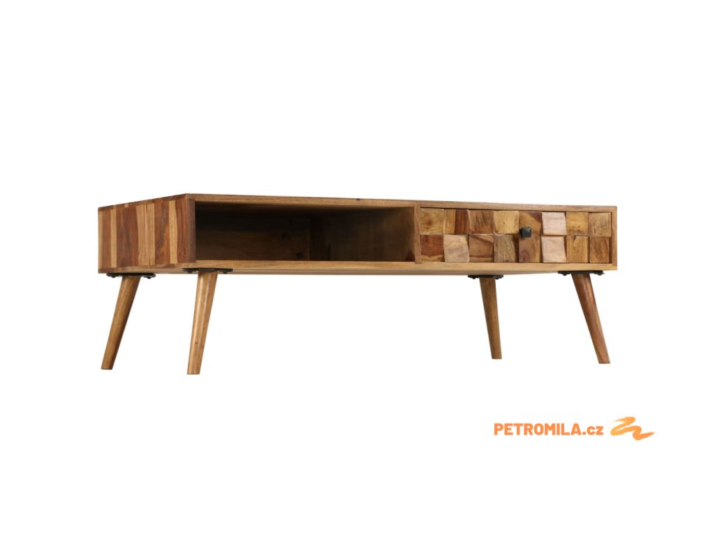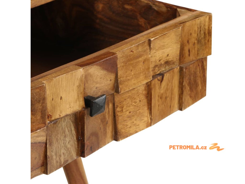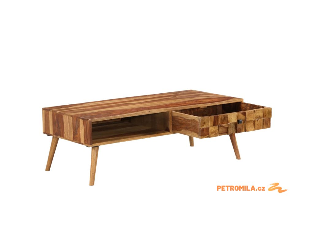 Tento stolek je vyroben z masivního akáciového dřeva a můžete jej rovněž použít jako odkládací či servírovací stolek. Akácie je tropické tvrdé dřevo, známé také jako rosewood nebo palisandr, které je proslulé svou bohatou texturou. Každá fáze výrobního procesu je prováděna s největší pečlivostí, ať už se jedná o leštění anebo lakování. Řemeslné zpracování a překrásná kresba dřeva se zasluhují o to, že je každý kus nábytku zcela jedinečný a lehce odlišný od ostatních. Tento stolek disponuje 1 úložnou přihrádkou a 1 zásuvkou, jež vám poskytnou spoustu prostoru pro ukládání knih, časopisů nebo jiných drobných předmětů, které chcete mít na dosah. Dřevěné nohy mu dodávají stabilitu a zvýrazňují jeho design ve stylu poloviny minulého století. Montáž je snadná.