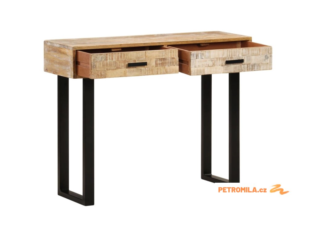 Stolní deska z masivního mangovníkového dřeva poskytuje spoustu místa pro vystavování dekorativních předmětů, zarámovaných fotografií, nebo i pokojových rostlin, zatímco drobné předměty, jako jsou klíče, zápisníky, pera a další drobnosti, můžete ukládat do dvou prostorných zásuvek. Železné krychlové nohy dodávají stolku bytelnost a industriální styl. Viditelná struktura dřeva propůjčuje každému kusu nábytku jedinečný a od ostatních lehce odlišný charakter.