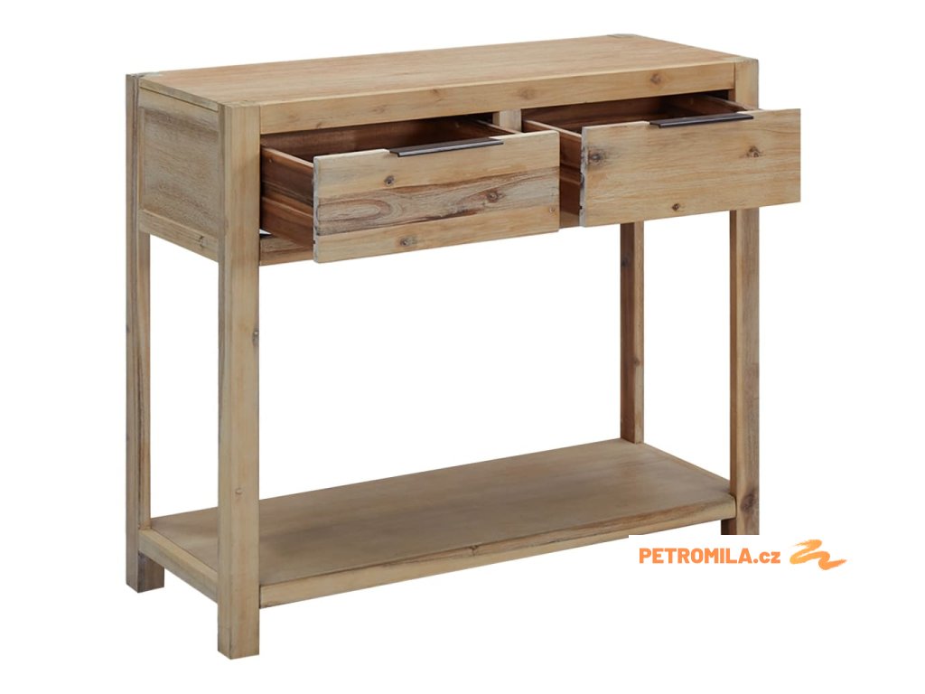 Tento konzolový stolek je vyroben z masivního akáciového dřeva s kartáčovanou povrchovou úpravou, MDF a akáciové dýhy, takže je robustní a stabilní. Konzolový stolek má robustní desku, na kterou můžete vystavit dekorativní předměty, jakou jsou mísy s ovocem či vázy. Polička a 2 zásuvky poskytují spoustu místa pro přehledné uspořádání nejrůznějších menších věcí, které tak budete mít neustále po ruce. Tento produkt je třeba nejdříve sestavit.