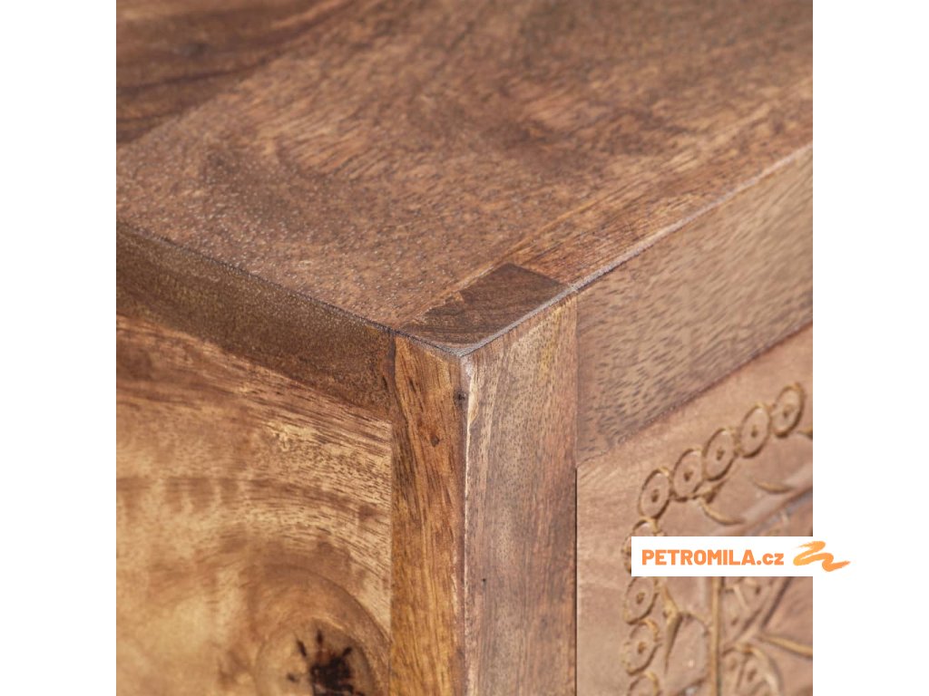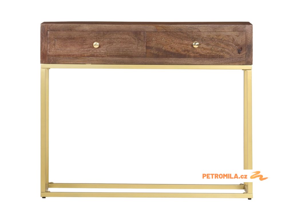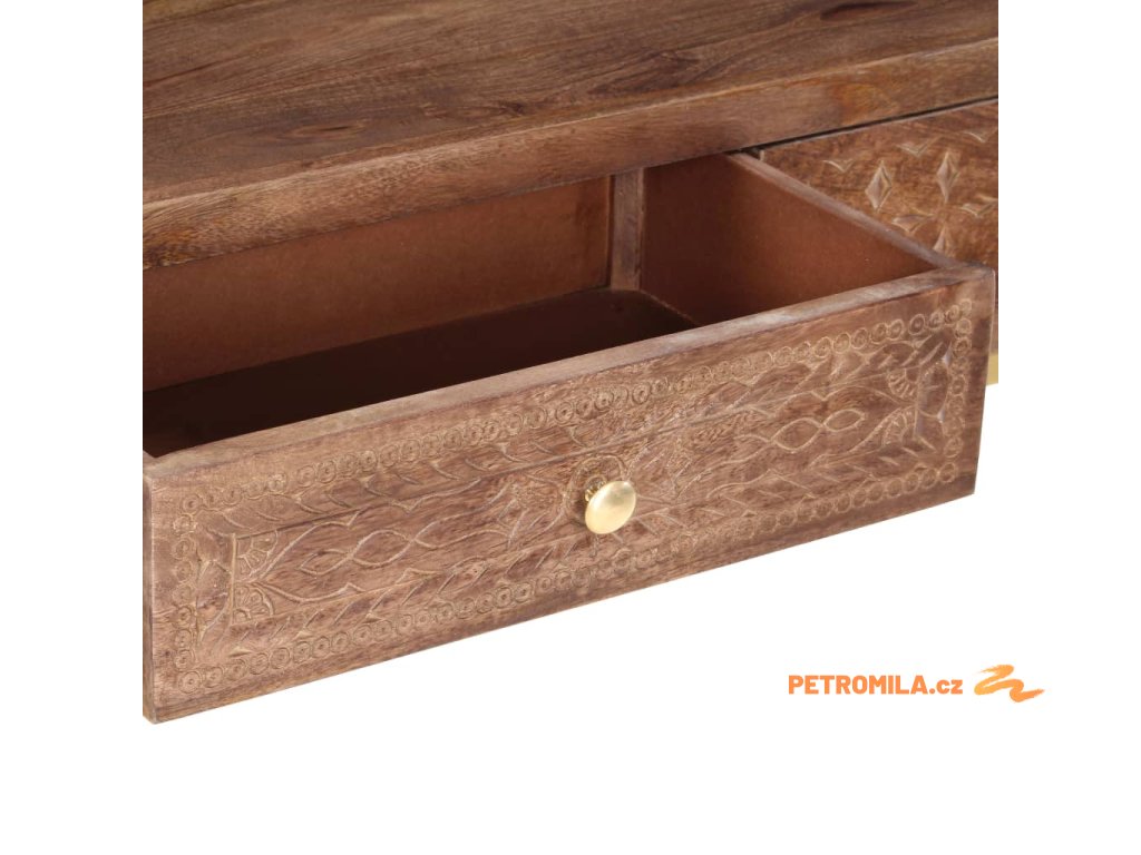 Konzolový stolek s ručně vyřezávaným čelem je zhotoven z masivního mangovníku, což je husté a robustní tvrdé dřevo, jehož povrch se vyznačuje hnědými či zlatými pruhy a konturami. Každá fáze výrobního procesu je prováděná s mimořádnou péčí, ať už se jedná o leštění nebo lakování. Řemeslné zpracování pak podtrhuje působivé retro vzezření nábytku. Krásná kresba dřeva je neopakovatelná a dává každému kusu nábytku unikátní charakter, kterým se lehce liší od všech ostatních. Práškově lakovaný ocelový rám přispívá k industriálnímu stylu nízkého stolku. Uvnitř najdete 2 zásuvky, které vám poskytnou spoustu prostoru k přehlednému ukládání všech možných maličkostí tak, abyste je měli vždy na dosah. Sestavení produktu je jednoduché.