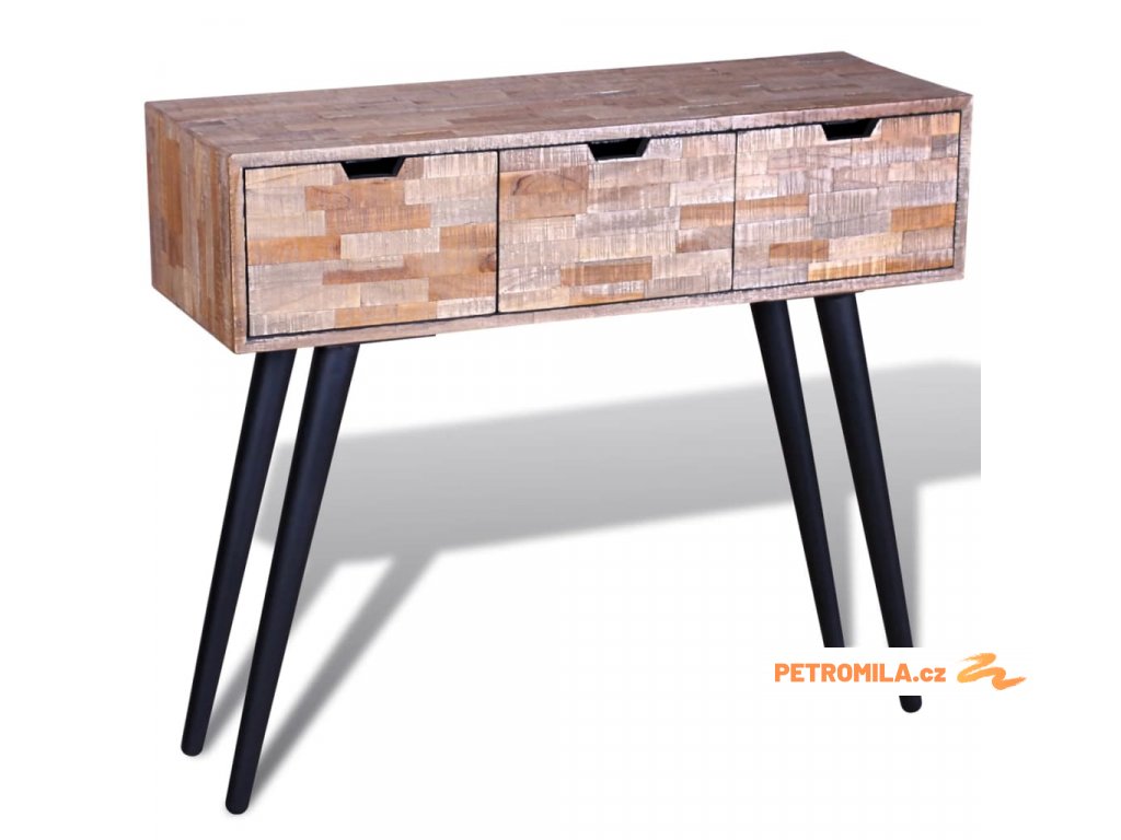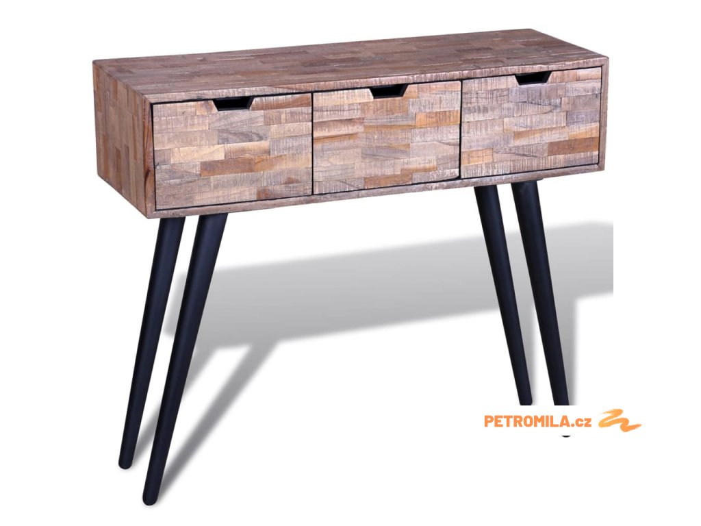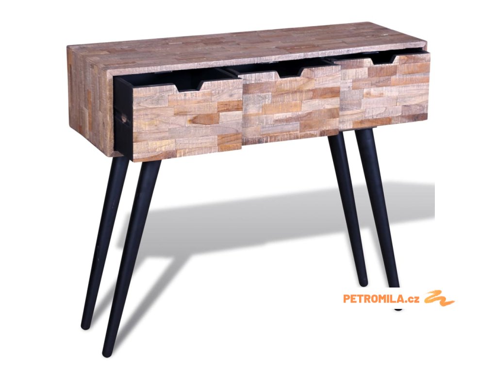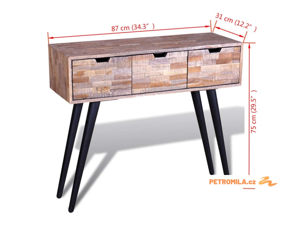 Tento kultivovaný teakový konzolový stolek je nadčasovým doplňkem pro váš domov. Jeho masivní dřevěná deska poskytuje dostatek prostoru pro dekorativní předměty, fotorámečky nebo dokonce hrnkové rostliny, zatímco vy můžete uložit malé předměty, jako jsou klíče, poznámkové bloky, pera a jiné drobnosti do jeho třech prostorných zásuvek. Může být také použit jako konzole skříně, příborník, skříňka, stolek atd