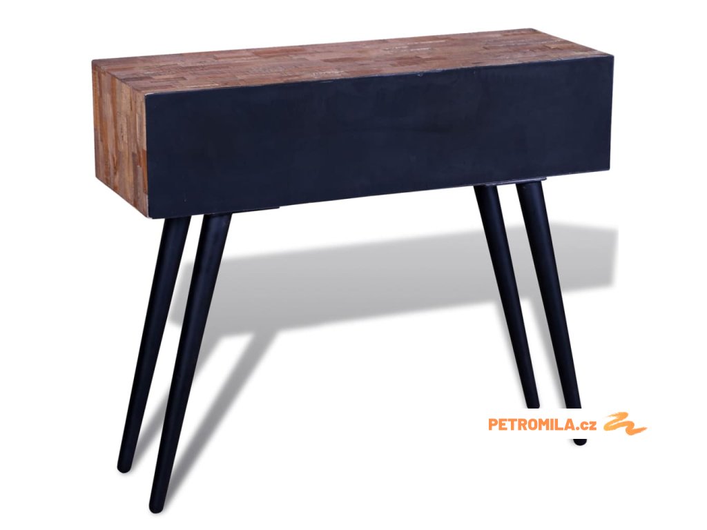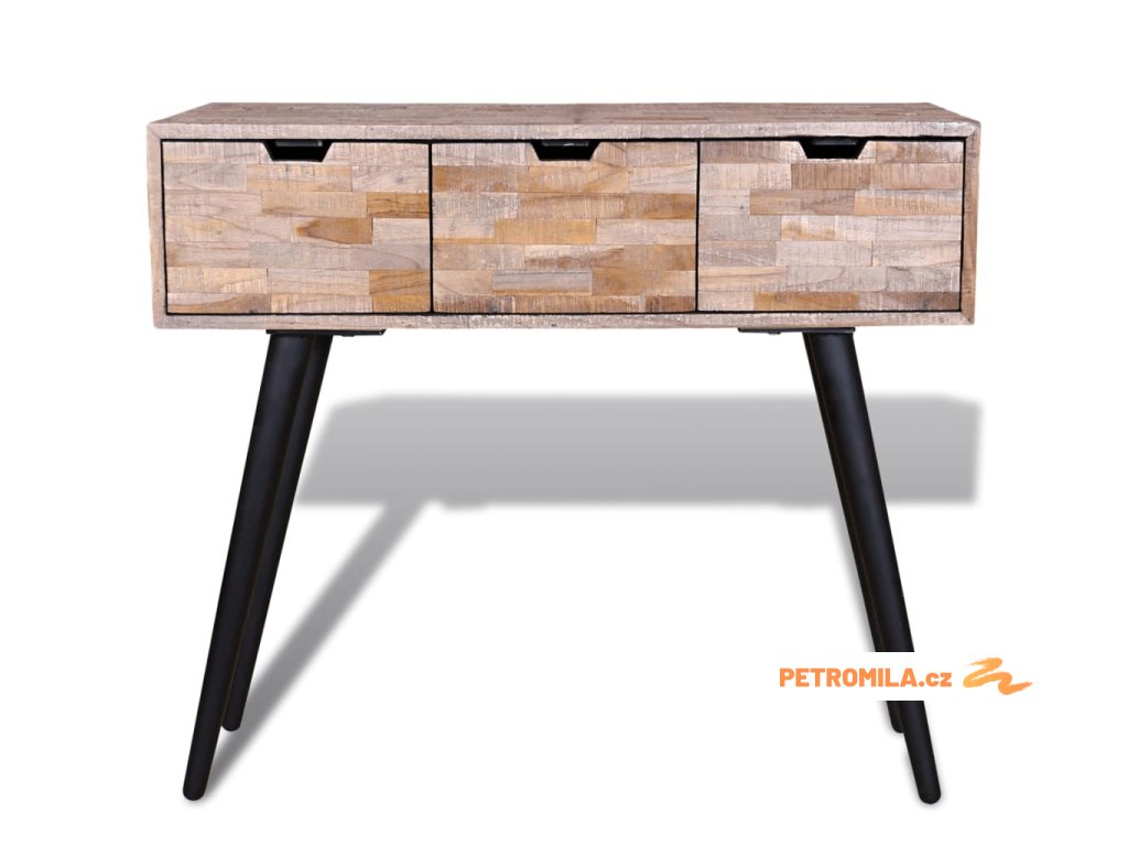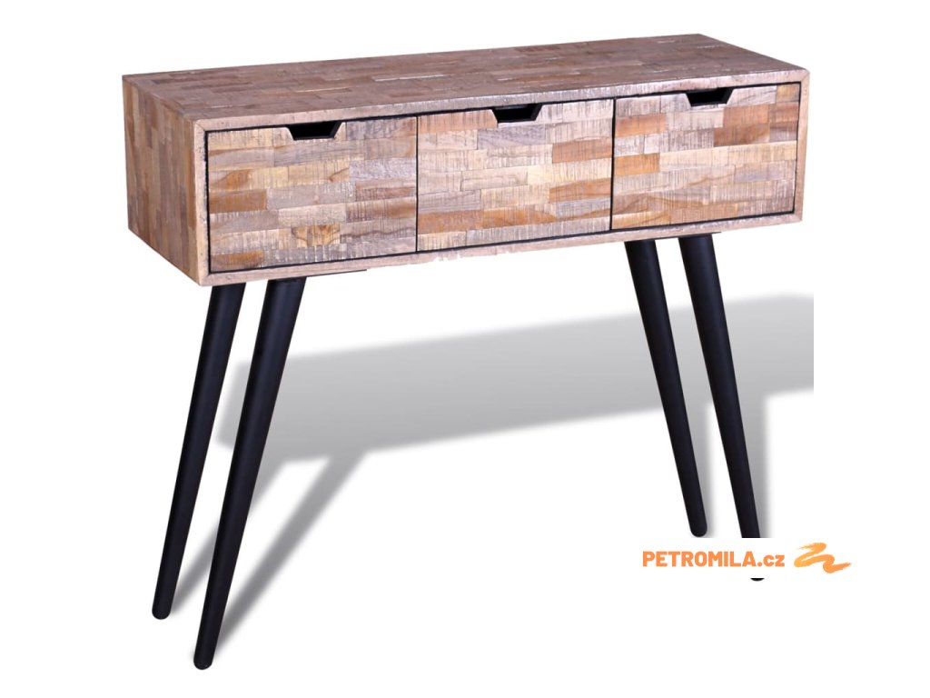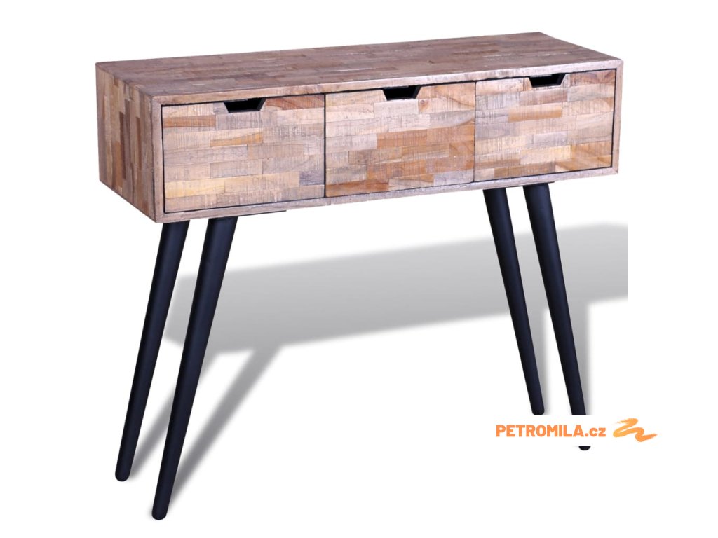Tento kultivovaný teakový konzolový stolek je nadčasovým doplňkem pro váš domov. Jeho masivní dřevěná deska poskytuje dostatek prostoru pro dekorativní předměty, fotorámečky nebo dokonce hrnkové rostliny, zatímco vy můžete uložit malé předměty, jako jsou klíče, poznámkové bloky, pera a jiné drobnosti do jeho třech prostorných zásuvek. Může být také použit jako konzole skříně, příborník, skříňka, stolek atd