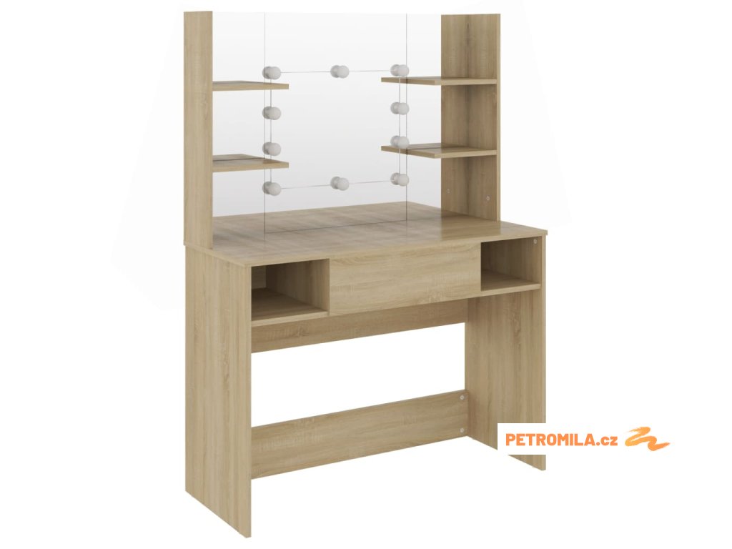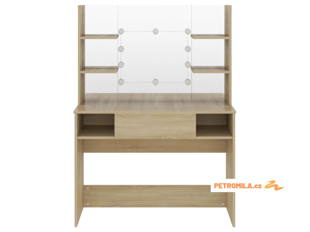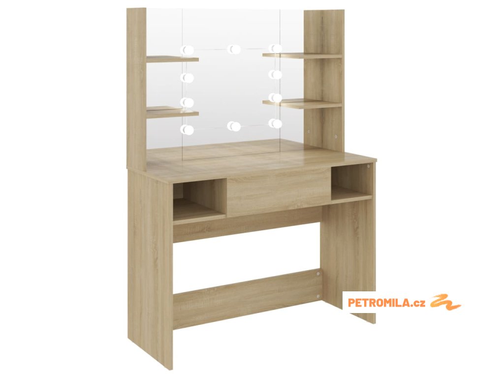 Tento toaletní stolek, vyrobený z MDF, zaujme elegantní siluetou a jednoduchými liniemi v moderním stylu. Nabízí dostatek prostoru pro vaše líčidla a budete tak mít vše pěkně uložené na svém místě. Krásné zrcadlo vám navíc usnadní aplikaci make-upu a zároveň dodává stolku elegantní vzhled. Elegantní LED žárovky vám poskytnou optimální osvětlení.