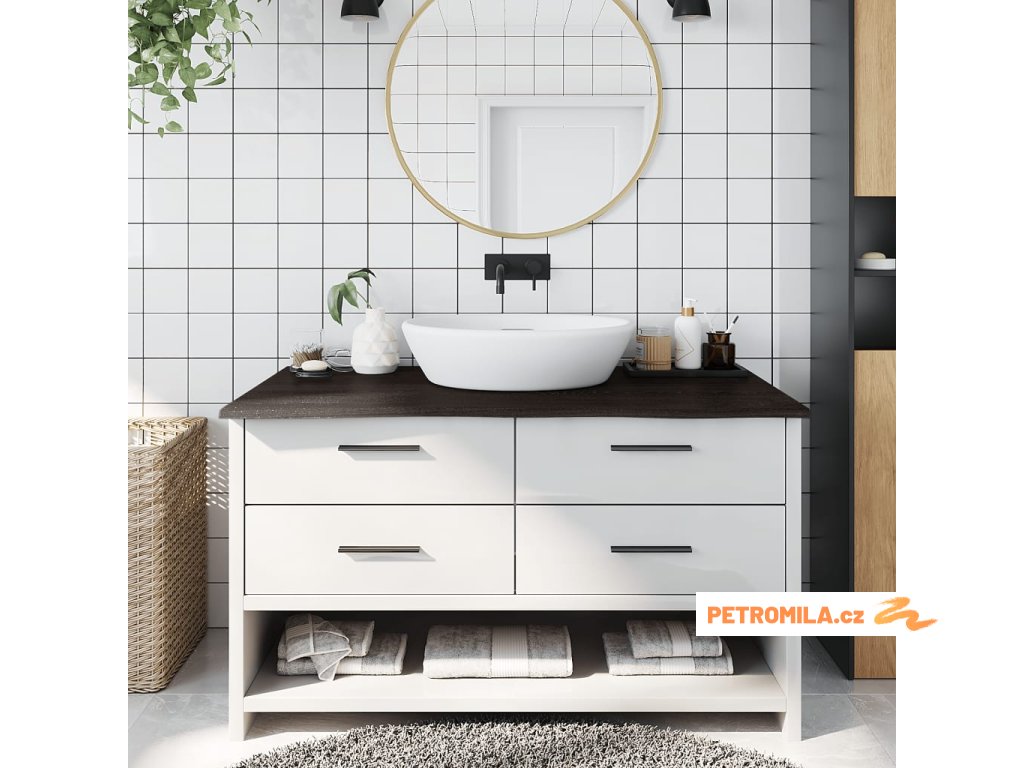 - Ošetřený povrch: Koupelnová deska byla ošetřena tmavou barvou, je tedy připravena k použití a není nutná žádná další povrchová úprava.