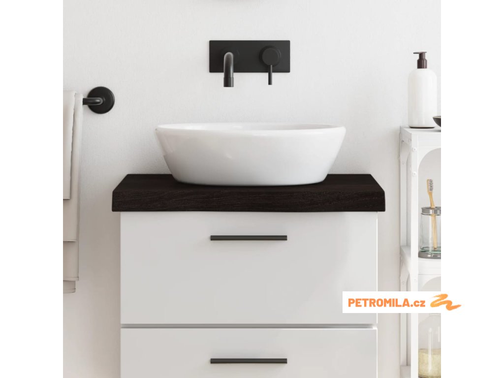 - Ošetřený povrch: Koupelnová deska byla ošetřena tmavou barvou, je tedy připravena k použití a není nutná žádná další povrchová úprava.