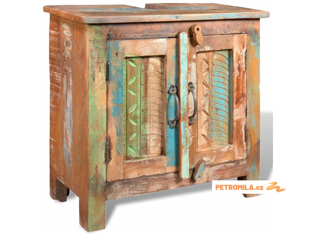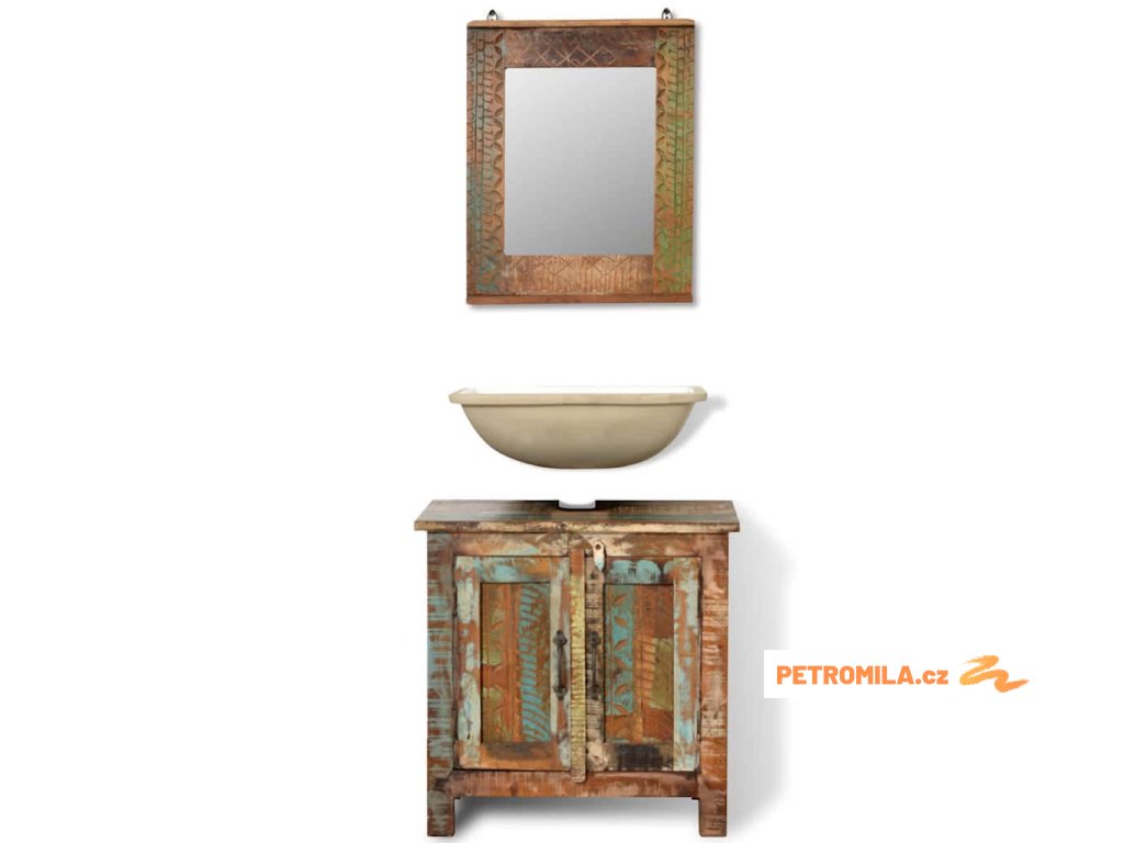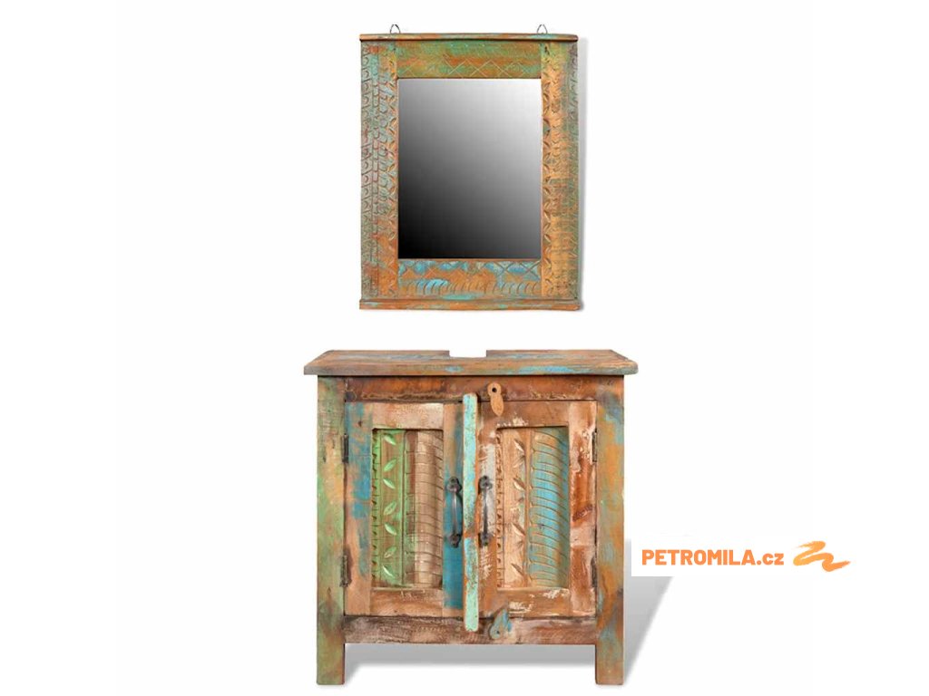 Skříňka je vysoká 60 cm a má dvě police. Kvůli umístění umyvalda je její masivní povrch opatřen otvorem. Zrcadlo s různobarevným rámem a vzorem je naprosto unikátní a stane se skvělým doplňkem každé koupelny.