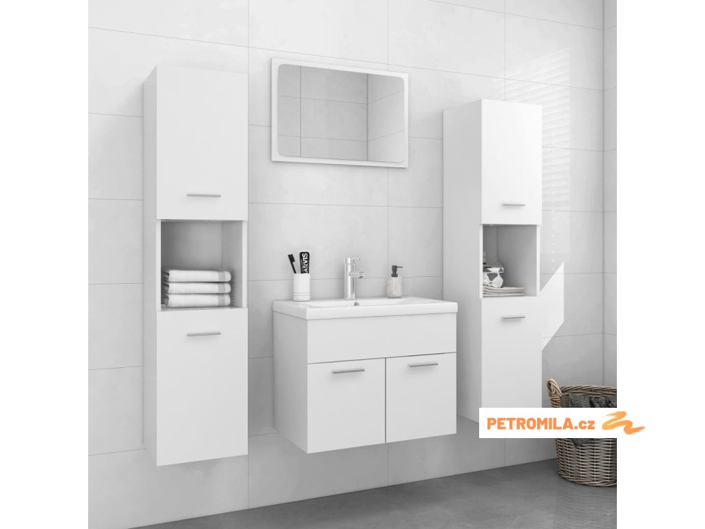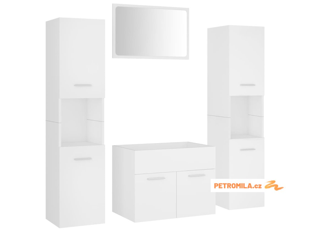 Sada nábytku obsahuje skříňku pod umyvadlo, 2 vysoké skříně a zrcadlo. Stylová umyvadlová skříňka má 1 přihrádku a nahoře je ideálně uzpůsobená k umístění umyvadla. V každé z vysokých skříní najdete za dvěma dvířky celkem 5 přihrádek, které vám poskytnou spoustu místa k uložení vašich věcí. Zrcadlo zase dodá vaší domácnosti nový půvab. Celý set koupelnového nábytku snadno očistíte navlhčeným hadříkem.