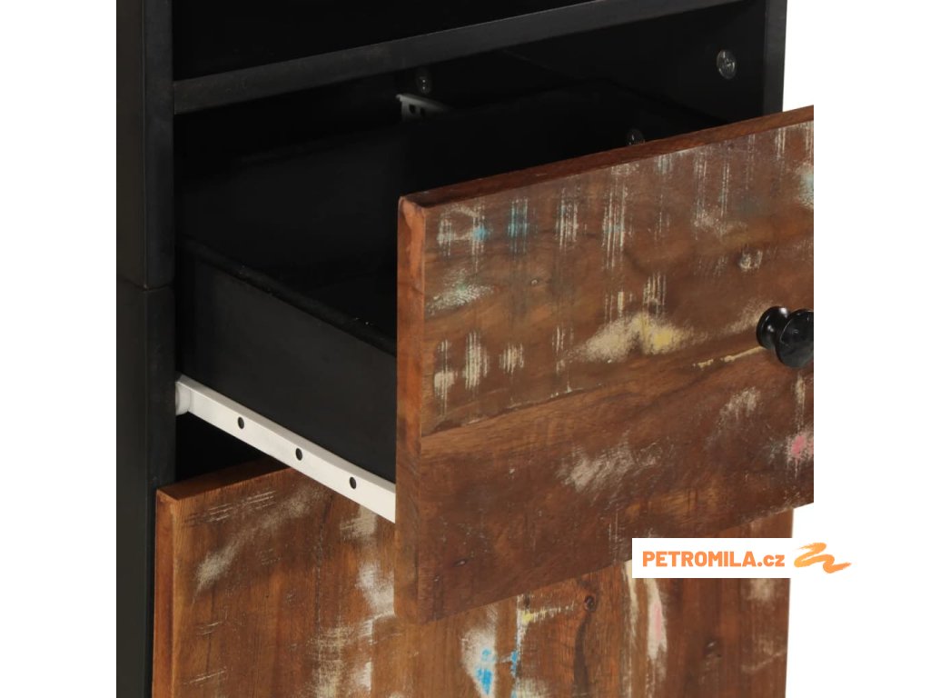 - Masivní recyklované dřevo: Tato koupelnová skříňka je vyrobena z masivního recyklovaného dřeva v kombinaci s kompozitním dřevem. Masivní recyklované dřevo se skládá z opakovaně použitých dřevin, jako je teak, mangovník, borovice a buk. Toto dřevo pochází ze starých staveb, jako jsou továrny, kůlny a lodě.
