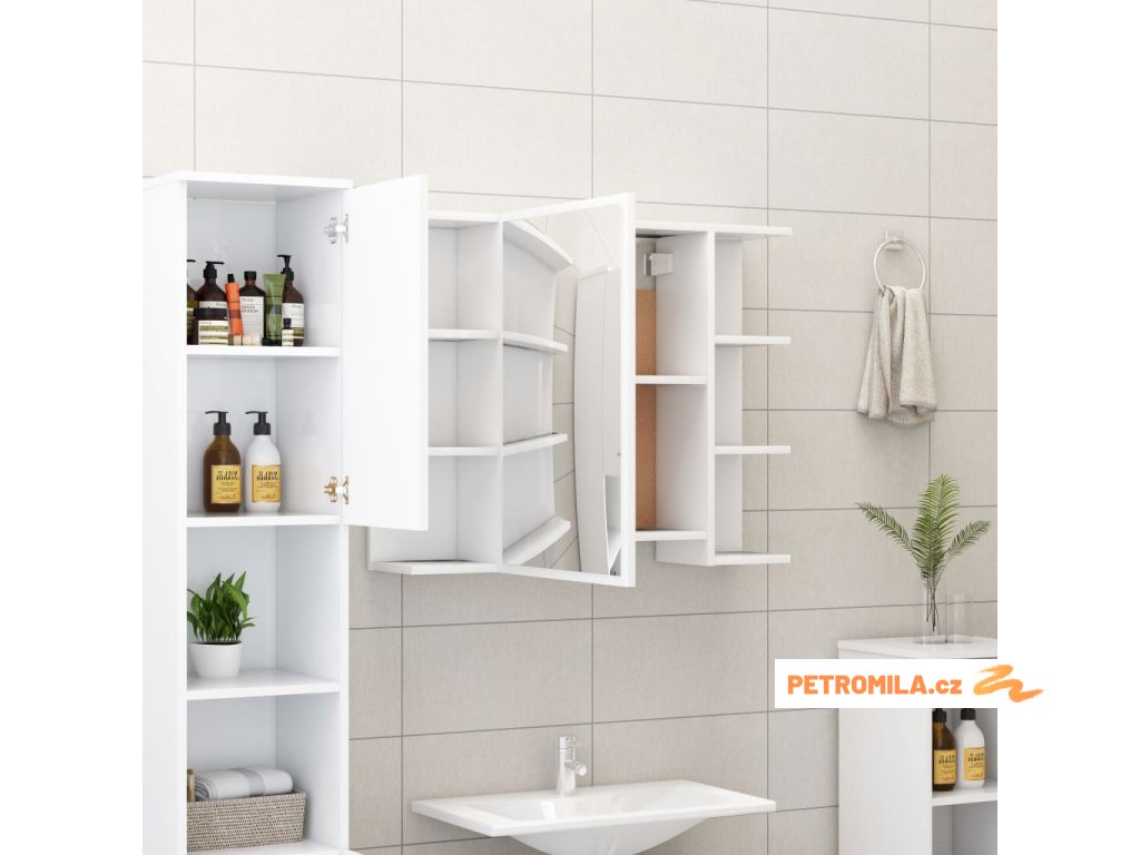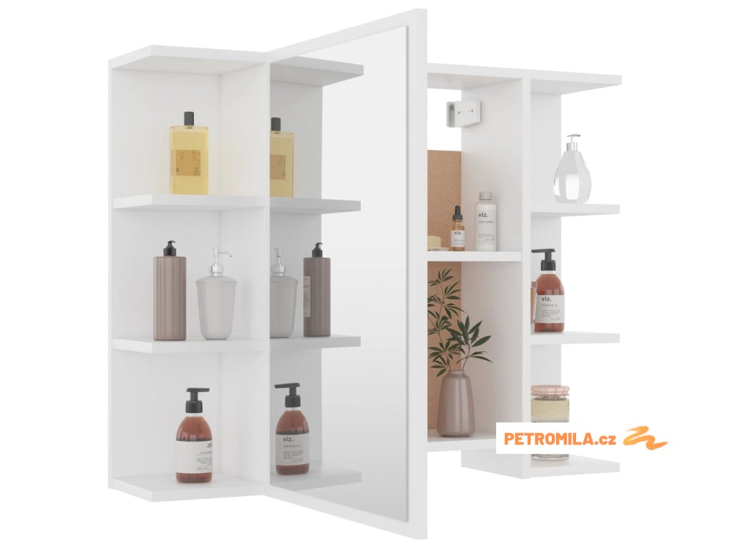 Nástěnná zrcadlová skříňka je vyrobená z kompozitního dřeva a akrylátu, je odolná a stabilní. Skříňka má 1 dvířka a celkem 8 přihrádek. 6 vnějších přihrádek poskytuje dostatek úložného prostoru, zatímco 2 vnitřní přihrádky nabízejí extra úložný prostor. Snadno si do ní uložíte vaše každodenní toaletní a kosmetické potřeby, jako jsou mýdla, šampony, zubní pasty atd.