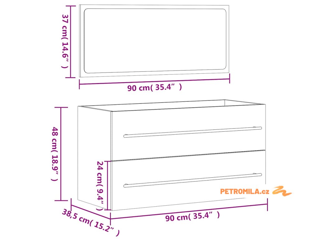 - Rozměry koupelnové skříňky: 90 x 38,5 x 48 cm (D x Š x V)