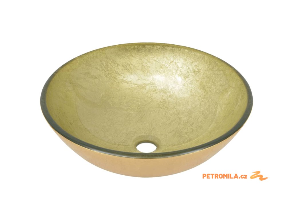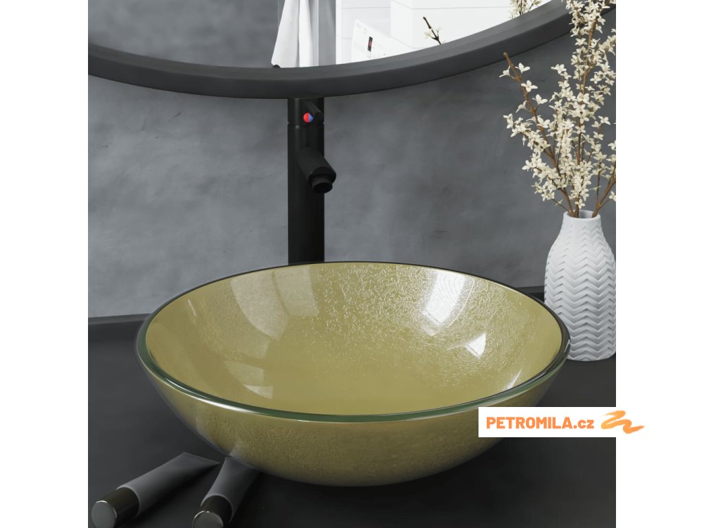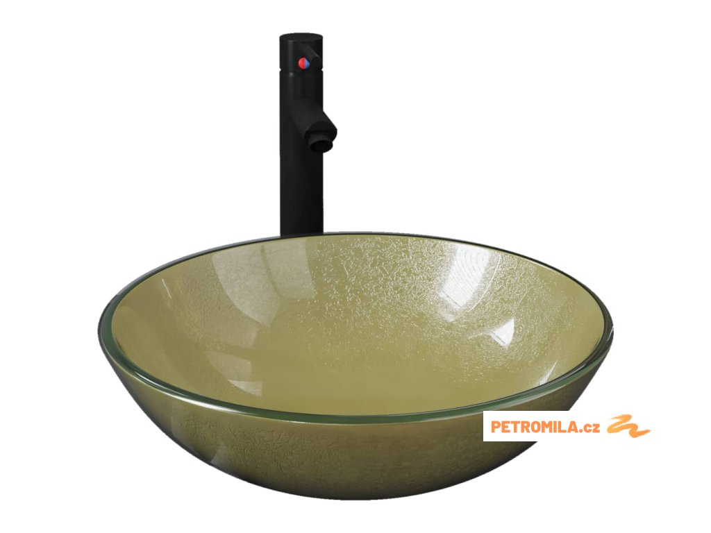 Koupelnové umyvadlo s baterií a výpustí zlaté tvrzené sklo