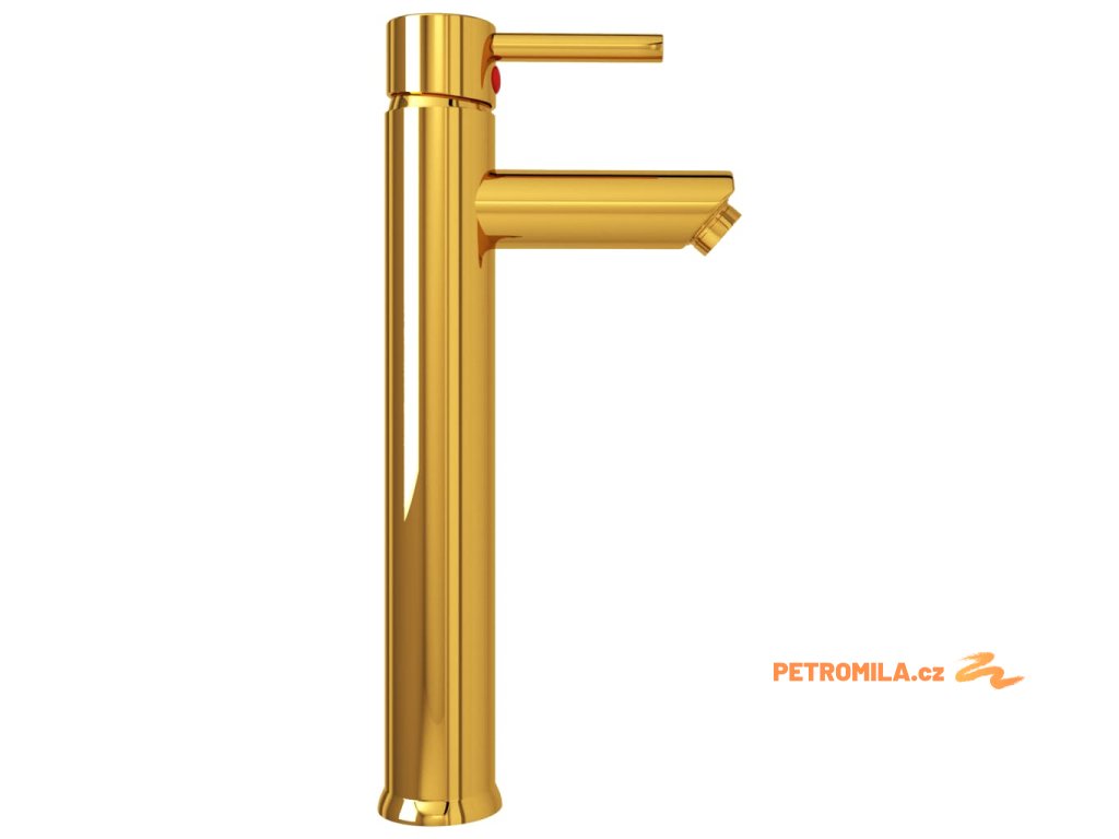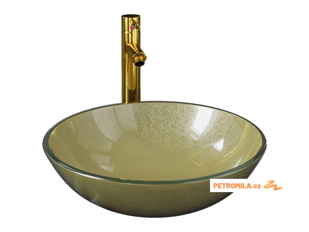 Koupelnové umyvadlo s baterií a výpustí zlaté tvrzené sklo