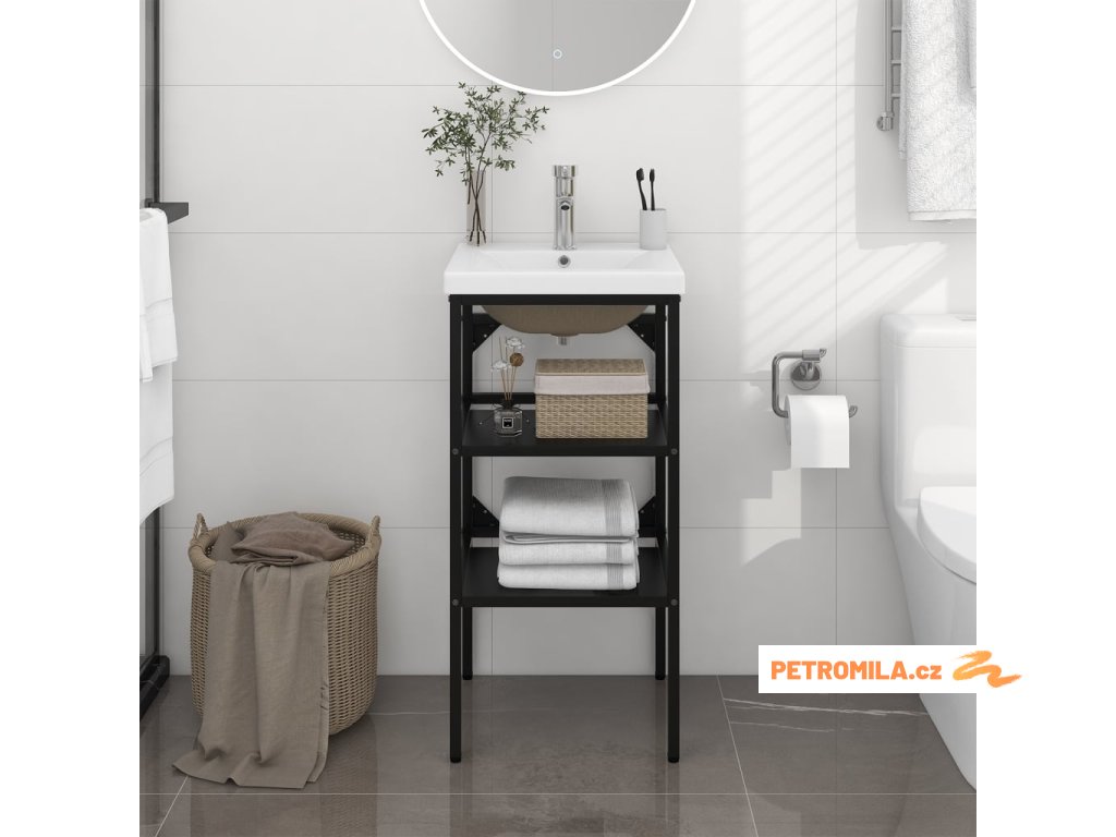 Stojan je vyroben z práškově lakovaného železa, takže je stabilní a odolný. Tento umyvadlový rám umožňuje snadný přístup k ručníkům a košíčkům a nabízí větší úložný prostor než uzavřené skříňky. Keramické umyvadlo je kromě praktického využití také ozdobou vašeho obytného prostoru. Se svým moderním designem se toto umyvadlo hodí do každého interiéru. Je vybavené přepadem pro odtékání vody a jeho glazovaný povrch přináší moderní a elegantní design. Rám i umyvadlo se navíc snadno čistí vlhkým hadříkem.