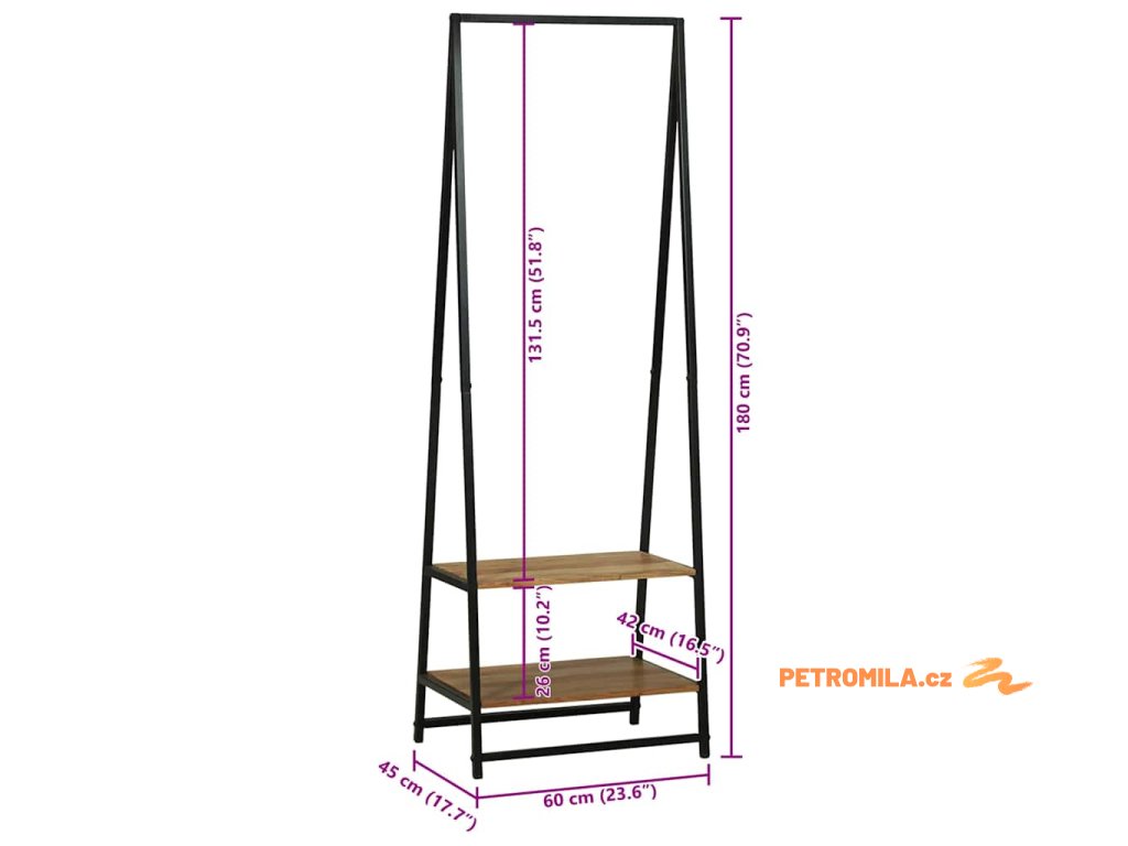 Tento moderní věšák na oblečení je perfektní kombinací stylu a praktičnosti. Díky svému minimalistickému designu se skvěle hodí do každého obýváku. Obdélníkový tvar a pevné akáciové i mangové dřevo mu dodávají trendy vzhled v černé a hnědé barvě, která se hodí k různým dekoracím. Ideální pro třídění oblečení, nabízí spoustu úložného prostoru a přináší moderní eleganci do vašeho domova.