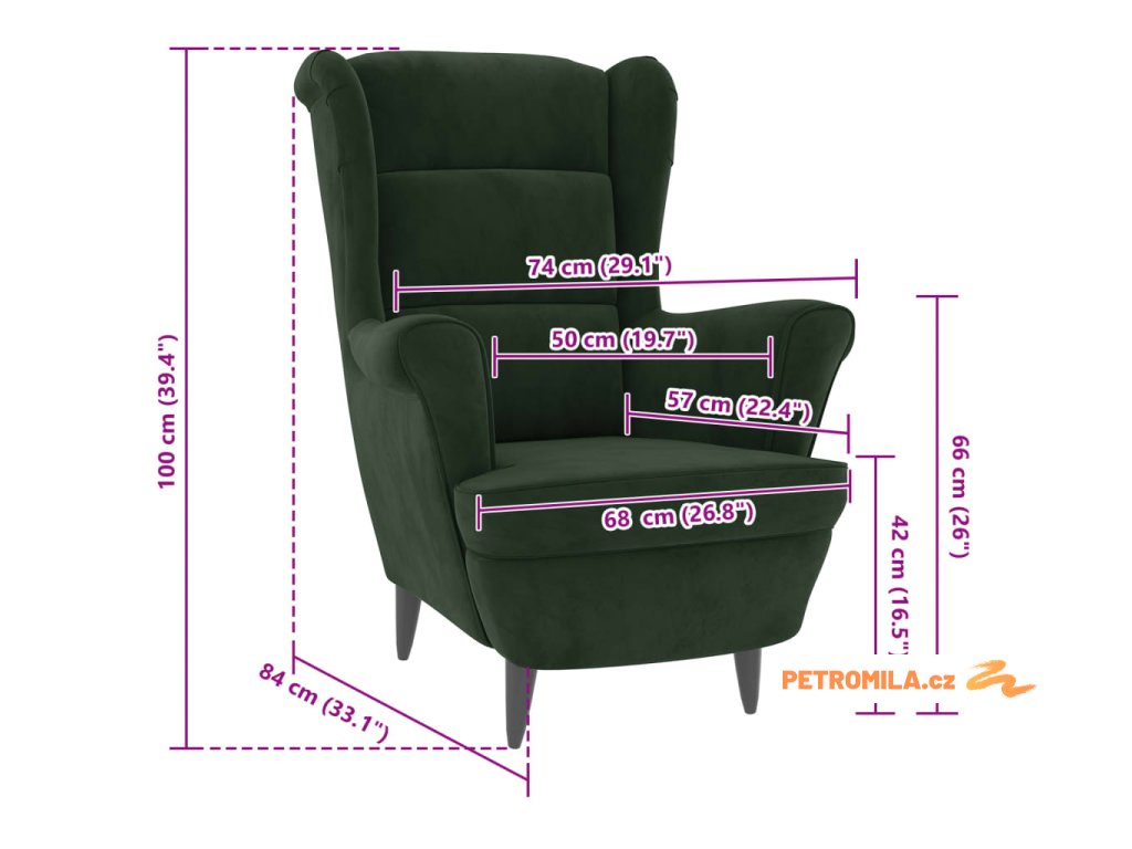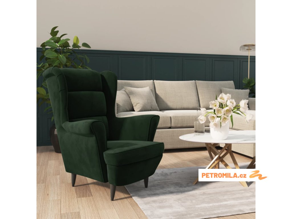 Křeslo je čalouněné sametem, je tedy velmi hebké na dotek a má dlouhou životnost. Stabilitu zajišťuje rám z překližky. Polstrované opěradlo a sedák vám zajistí pohodlné posezení.