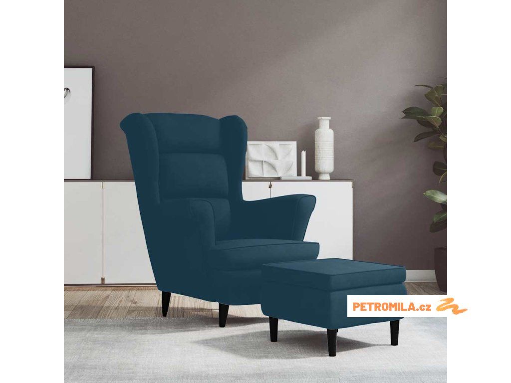 Křeslo ušák se stoličkou modré samet