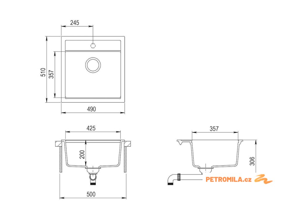 - Rozměry umyvadla: 425 x 357 x 200 mm (D x Š x H)