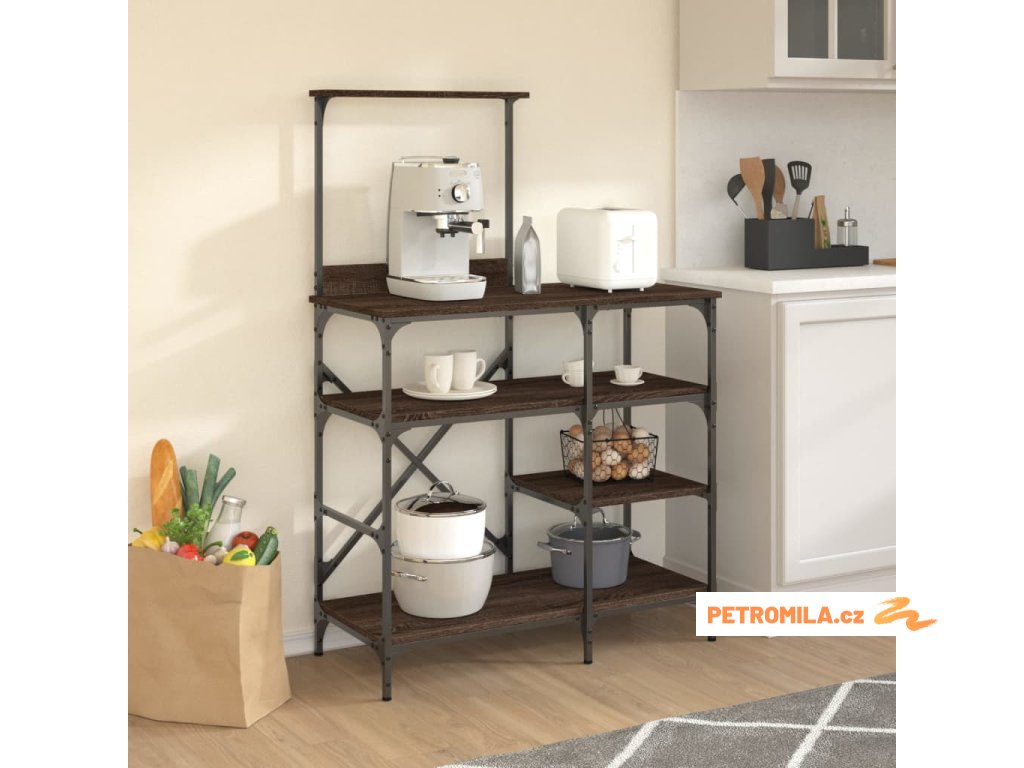- Dostatek úložného prostoru: Kuchyňský úložný regál s horní policí na kořenky a velkými spodními policemi na kuchyňské spotřebiče nabízí dostatek úložného prostoru pro lepší organizaci vaší kuchyně.