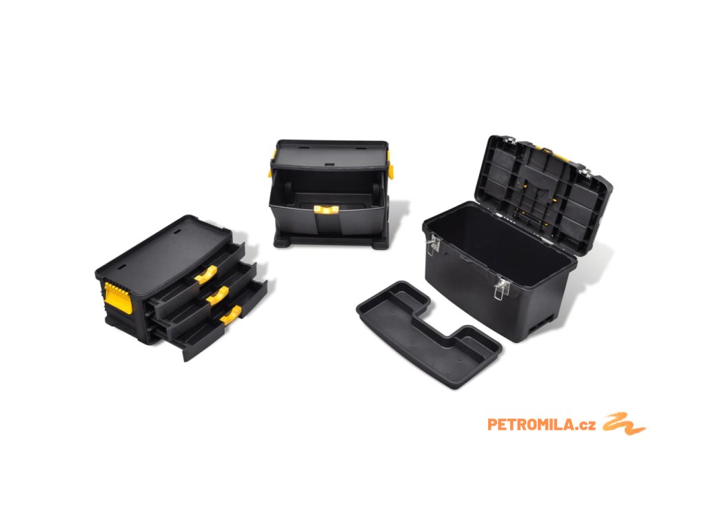 Jak horní, tak spodní přihrádka jsou dostatečně prostorné, abyste do nich mohli ukládat velké nástroje. Menší nářadí a materiál, jako jsou šrouby a matice, si můžete optimálně zorganizovat do střední přihrádky se zásuvkami. Horní přihrádku, která je zajištěná bočními přezkami, můžete oddělit a používat také samostatně.