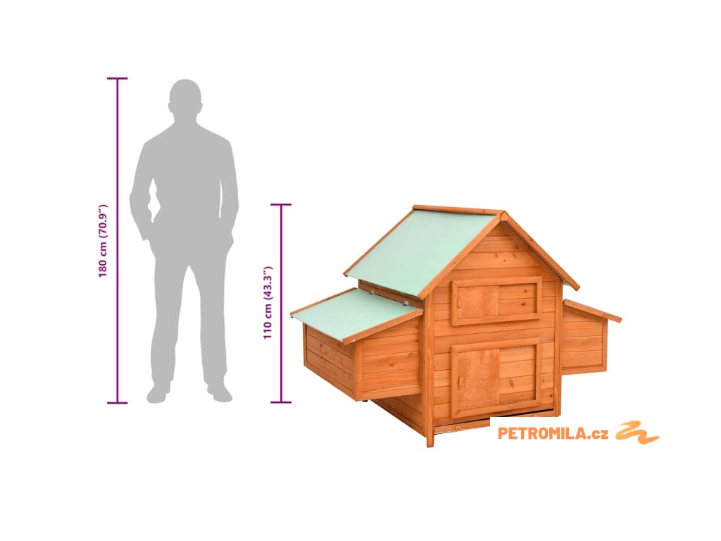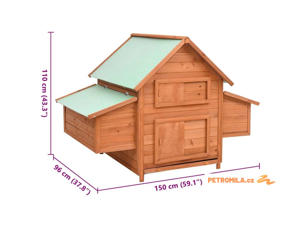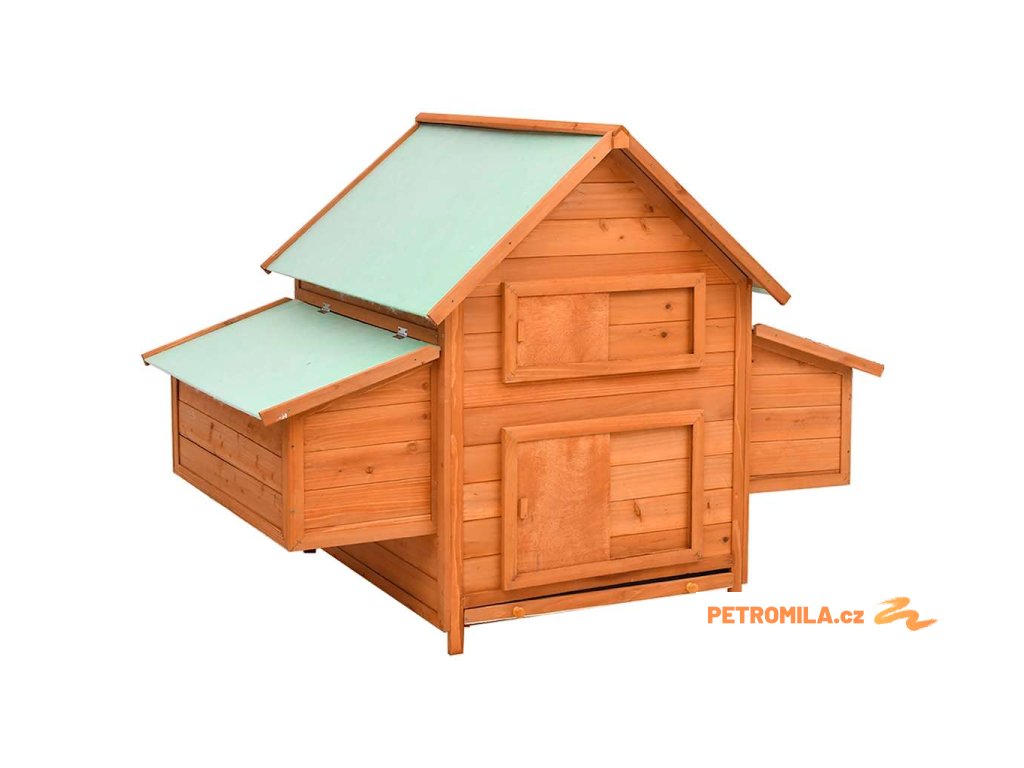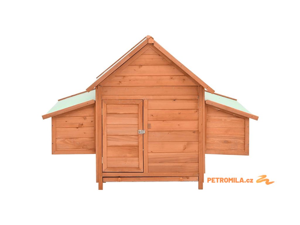 Kurník je vyrobený z masivního jedlového dřeva, takže je pevný a odolný. Nepromokavá tkanina na střechách udržuje slepice v suchu a vytváří pro ně teplé a pohodlné prostředí k odpočinku.
