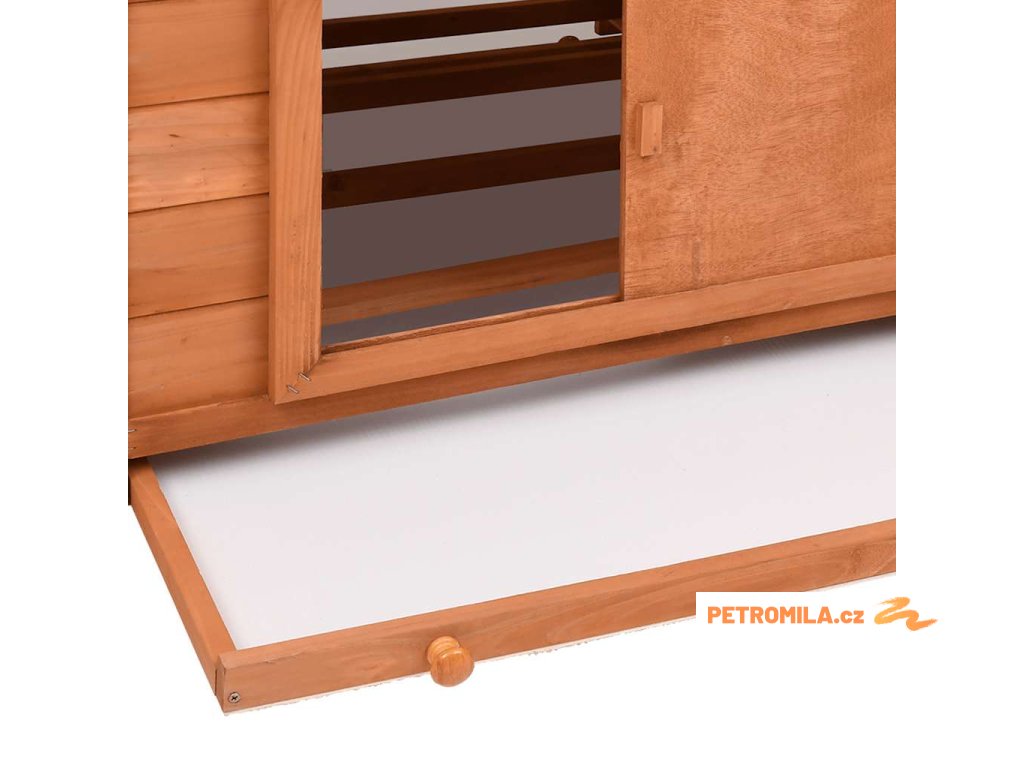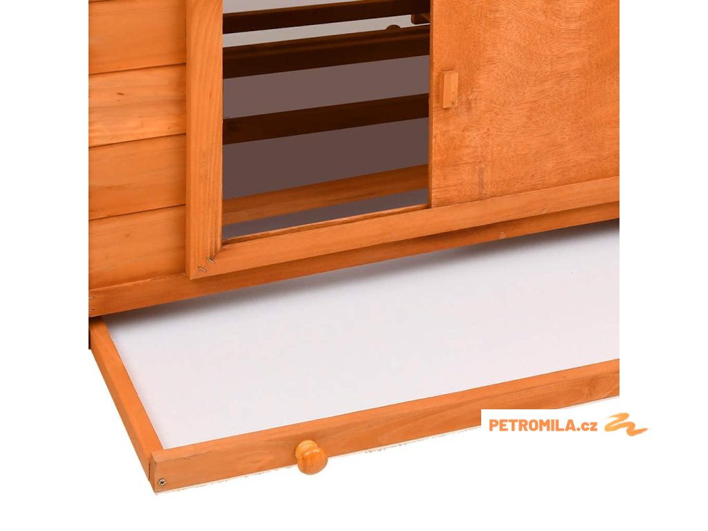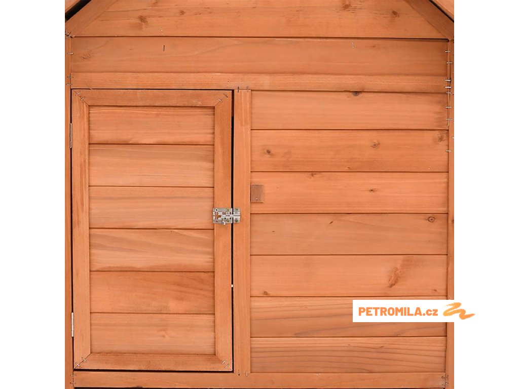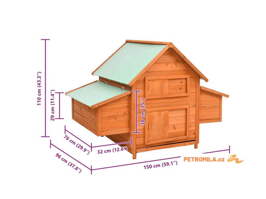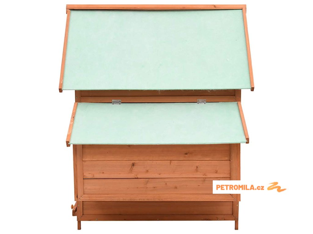 Kurník je vyrobený z masivního jedlového dřeva, takže je pevný a odolný. Nepromokavá tkanina na střechách udržuje slepice v suchu a vytváří pro ně teplé a pohodlné prostředí k odpočinku.