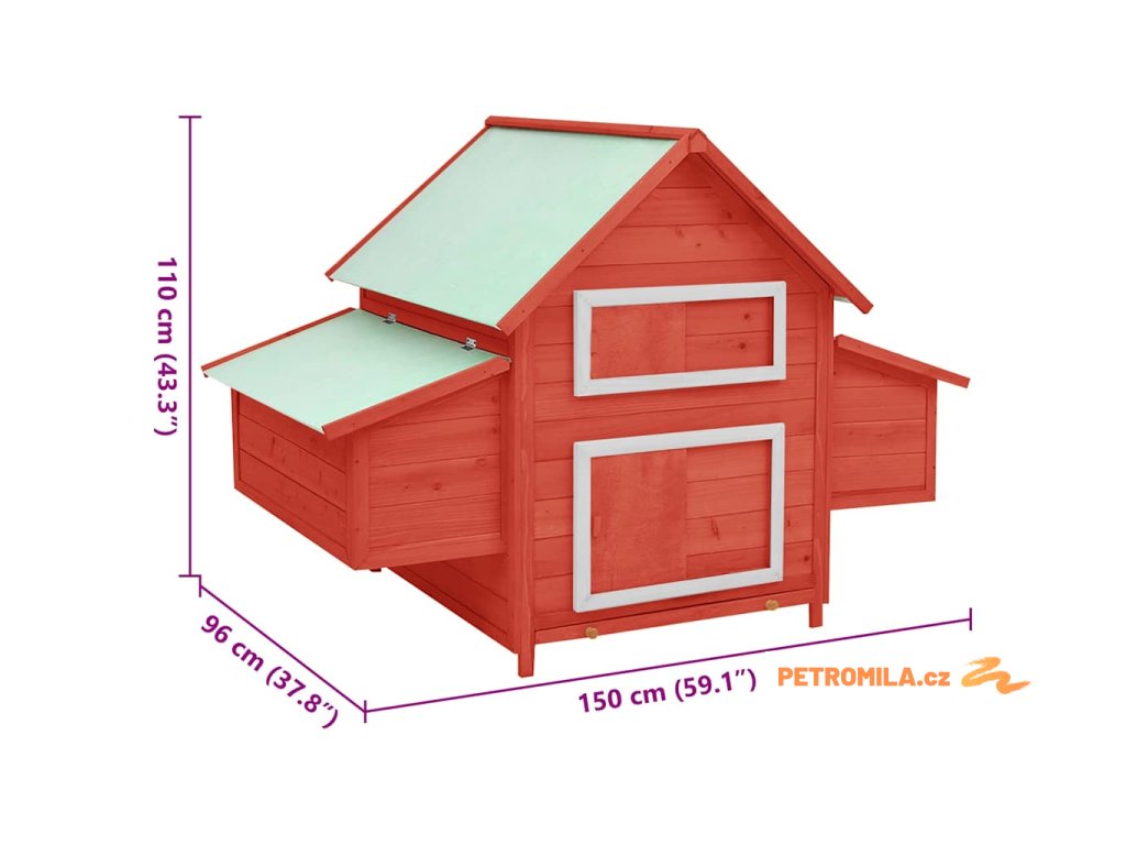 Kurník je vyrobený z masivního jedlového dřeva, takže je pevný a odolný. Nepromokavá tkanina na střechách udržuje slepice v suchu a vytváří pro ně teplé a pohodlné prostředí k odpočinku.