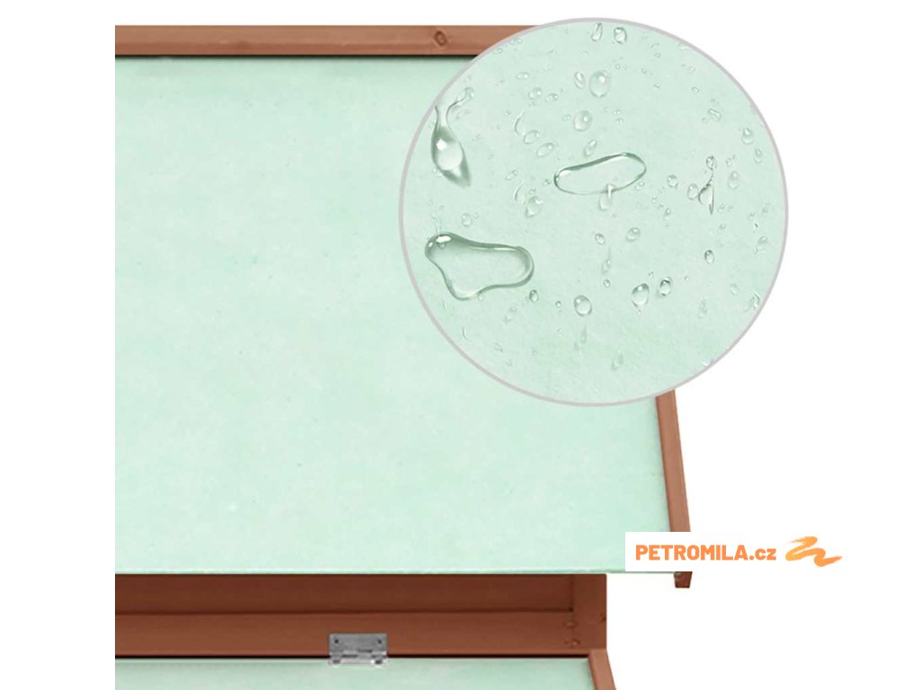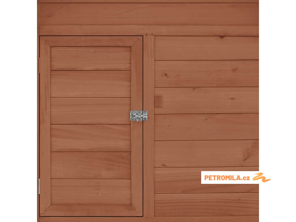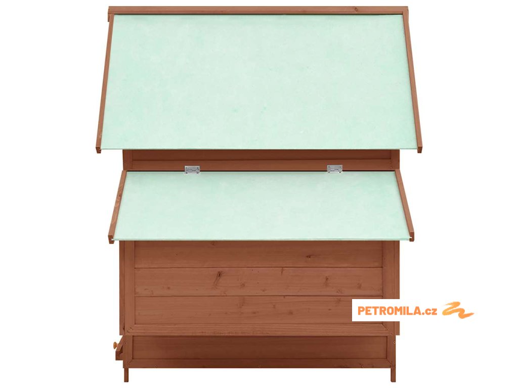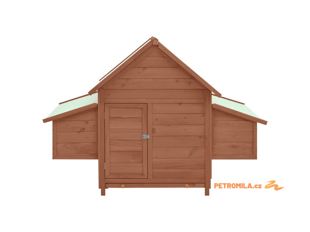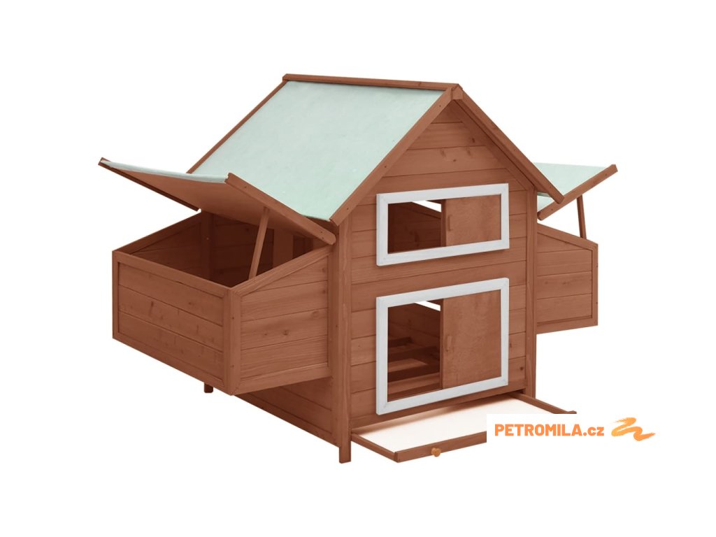 Kurník je vyrobený z masivního jedlového dřeva, takže je pevný a odolný. Nepromokavá tkanina na střechách udržuje slepice v suchu a vytváří pro ně teplé a pohodlné prostředí k odpočinku.