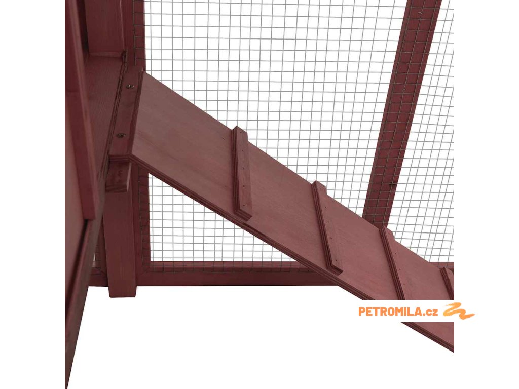 Kurník má komplexní design s jedním domečkem, jednou kukaní a velmi velkým výběhem s pozinkovaným ocelovým pletivem, které vám dává dobrý přehled o dění uvnitř a drůbeži zaručuje dostatek čerstvého vzduchu. Kurník tvoří rám z masivního jedlového dřeva, takže má dlouhou životnost. Sklopná střecha je pokrytá voděodolnou textilií a chrání obyvatele před deštěm. Uvnitř domku se nachází perfektní prostor na spaní. Protiskluzová rampa spojuje přízemí s horním patrem a vytahovací dno usnadňuje čištění.