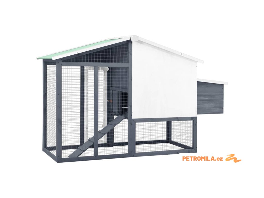Kurník má komplexní design s jedním domečkem, jednou kukaní a velmi velkým výběhem s pozinkovaným ocelovým pletivem, které vám dává dobrý přehled o dění uvnitř a drůbeži zaručuje dostatek čerstvého vzduchu. Kurník tvoří rám z masivního jedlového dřeva, takže má dlouhou životnost. Sklopná střecha je pokrytá voděodolnou textilií a chrání obyvatele před deštěm. Uvnitř domku se nachází perfektní prostor na spaní. Protiskluzová rampa spojuje přízemí s horním patrem a vytahovací dno usnadňuje čištění.