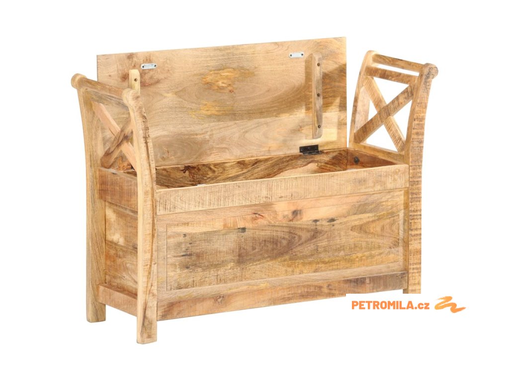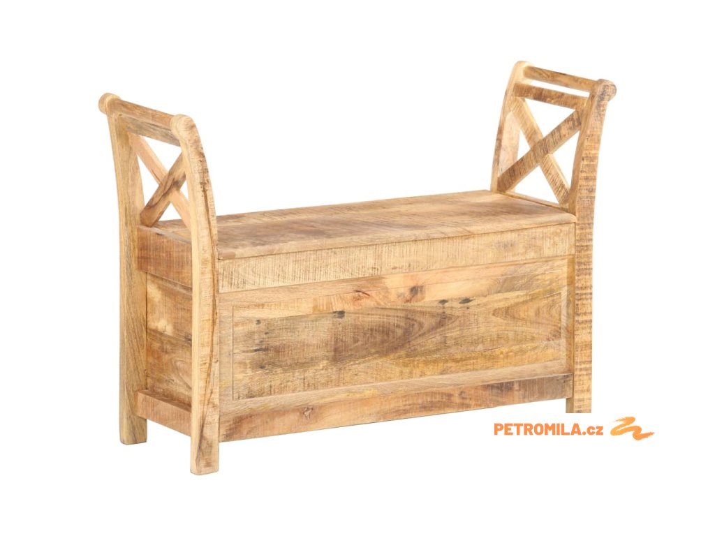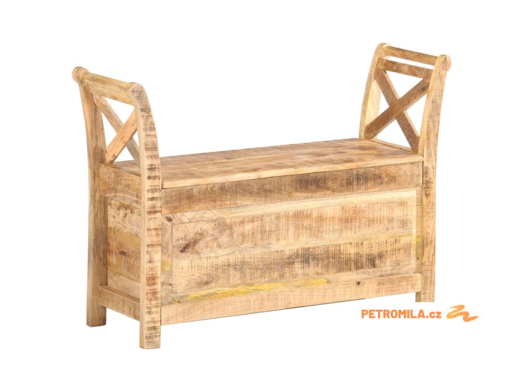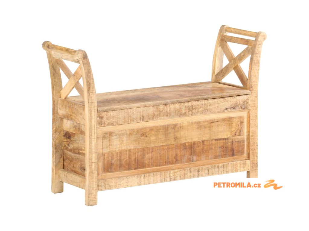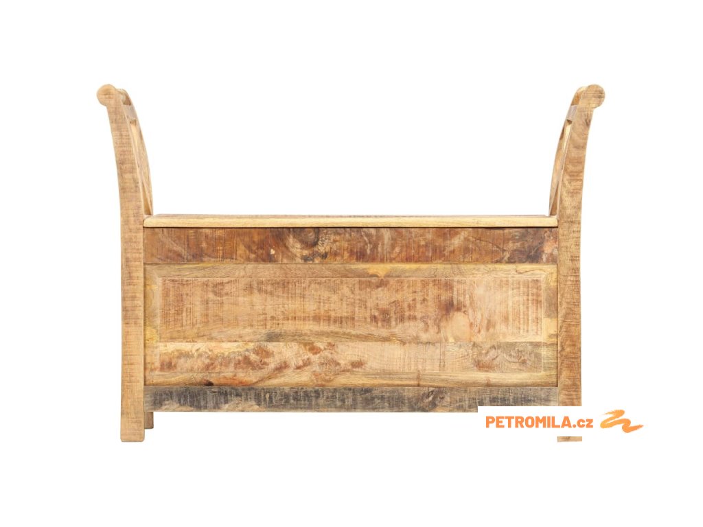 Lavice je vyrobená z masivního mangovníku, což je tvrdé dřevo s hustou texturou. Hrubé mangovníkové dřevo je nejen schopné unést značnou váhu, ale zároveň také výborně odolává opotřebení a působení času. Lavička s překrásným designem je proto velice stabilní, trvanlivá a poutavá na pohled. Lavice má dvě prohnuté područky, které jsou praktické a zároveň elegantní. Uvnitř lavice je úložný prostor, kam si můžete organizovaně ukládat polštáře, hračky, podušky a další nezbytnosti, které chcete mít po ruce. Řemeslné zpracování a elegantní kresba dřeva dává každému kusu nábytku jedinečný a od ostatních lehce odlišný charakter. Sestavení lavice do předsíně je snadné.