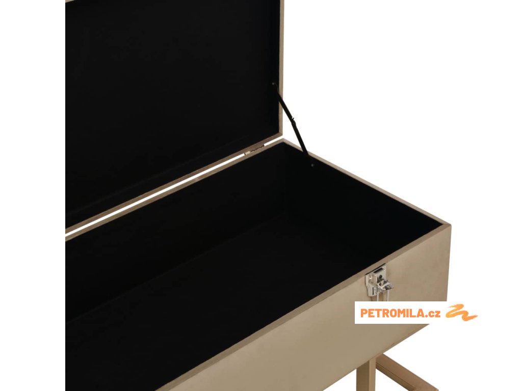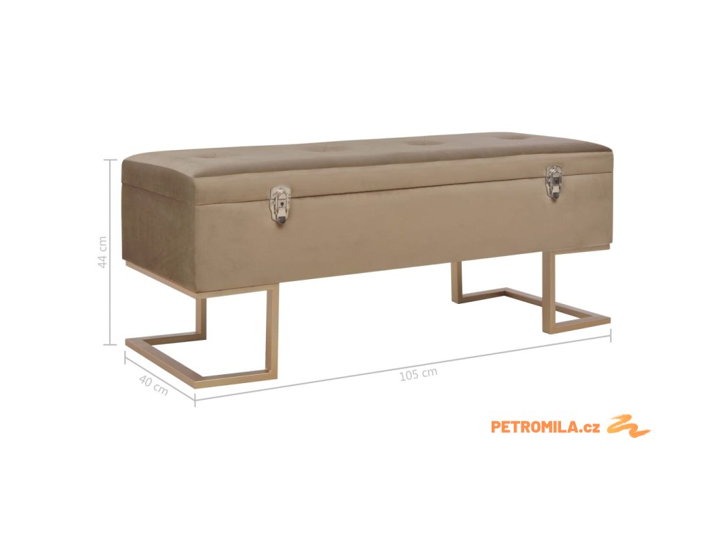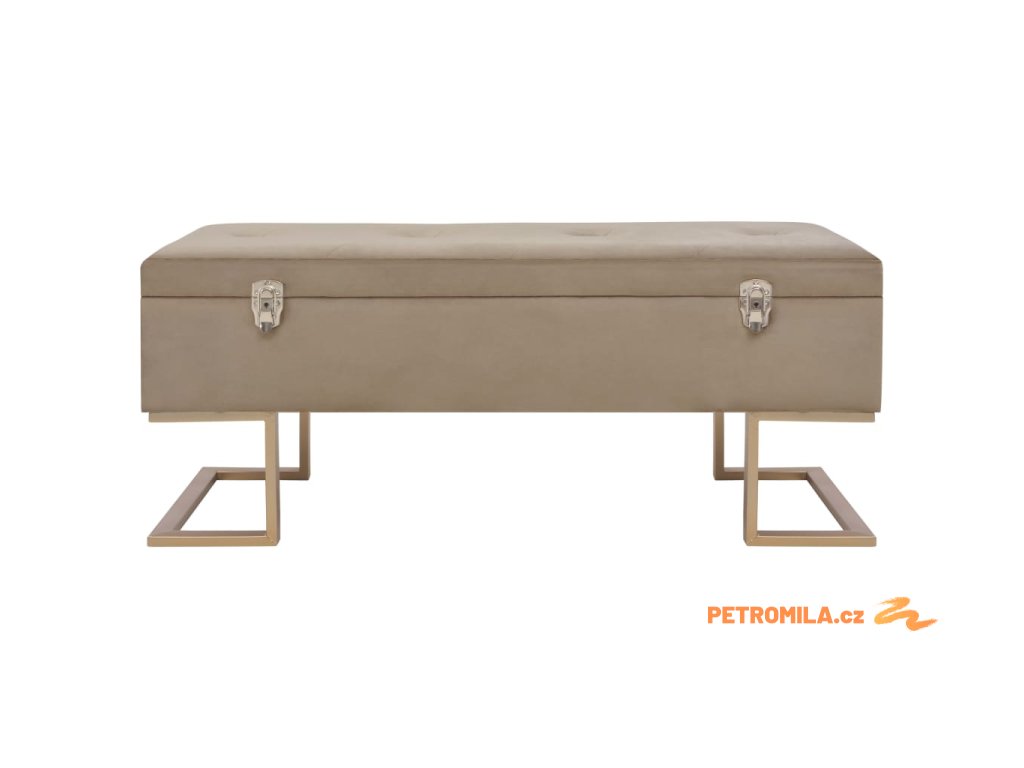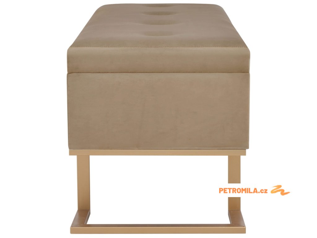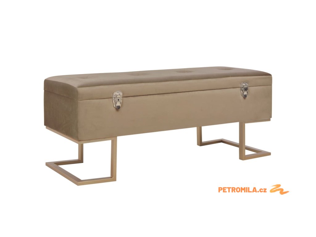 Sametové čalounění v béžové barvě je měkké na dotek a velmi pohodlné a svou barvou oživí každý interiér. Disponuje vestavěným úložným prostorem, který poskytuje dodatečné místo pro uschování nejrůznějších věcí. Nohy ze železa s práškovým nástřikem a zlatým nátěrem lavičce dodávají na stabilitě a životnosti. Naše lavice vnese do vašeho interiéru autentické kouzlo a stane se nedílnou součástí vašeho pokoje.