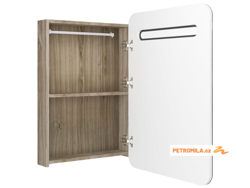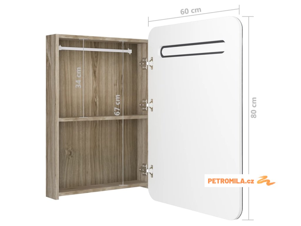 Je vyrobená z kvalitní MDF desky s melaminovou povrchovou úpravou, která zaručuje dlouholetou životnost. Integrovaná LED trubka v horní části vám poskytne optimální osvětlení pro líčení, holení či péči o pokožku. Dokonale rozzáří celou místnost, vaši tvář i váš úsměv. Ve skříňce za dvoukřídlými dvířky najdete dostatek úložného prostoru. Zde si můžete uspořádat své nezbytné toaletní potřeby, jako jsou mýdla, šampony, zubní pasty atd. Tato stylová a funkční skříňka ozvláštní vskutku jedinečným způsobem vybavení vaší koupelny!