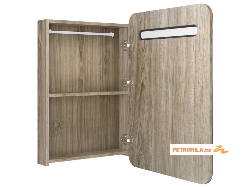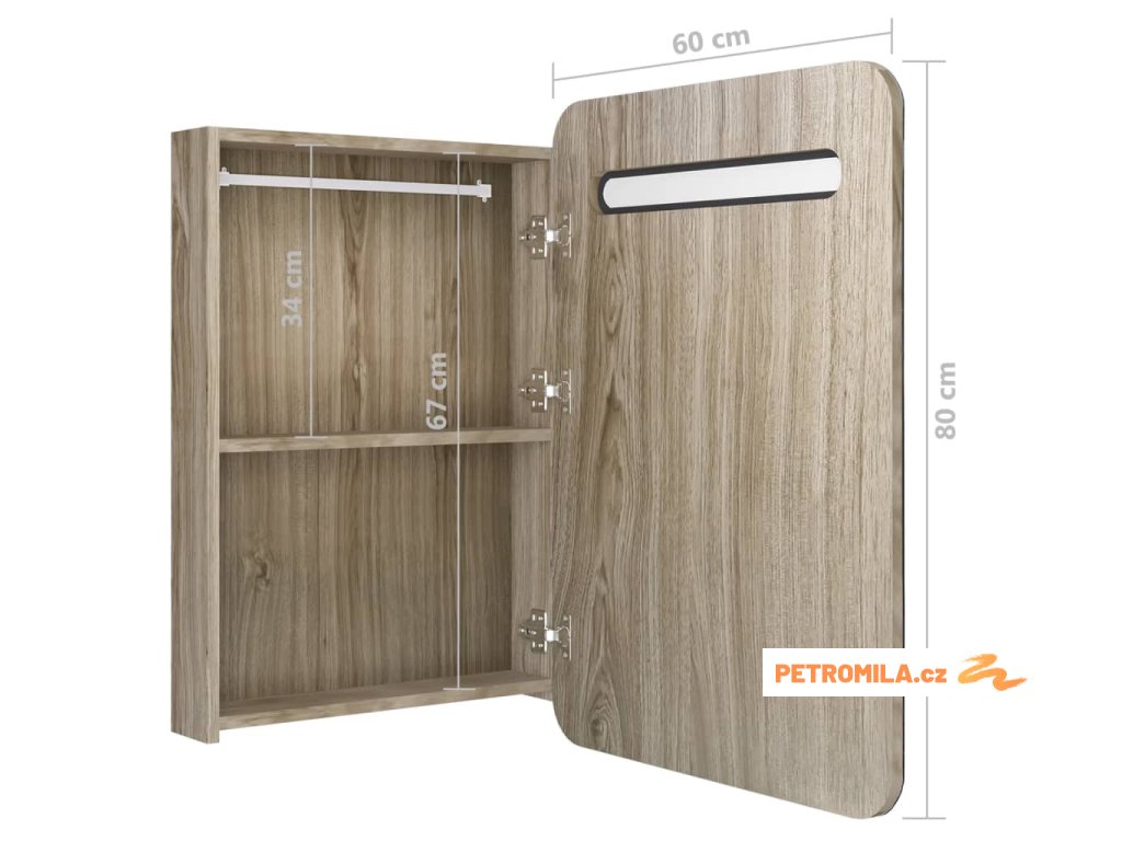 Je vyrobená z kvalitní MDF desky s melaminovou povrchovou úpravou, která zaručuje dlouholetou životnost. Integrovaná LED trubka v horní části vám poskytne optimální osvětlení pro líčení, holení či péči o pokožku. Dokonale rozzáří celou místnost, vaši tvář i váš úsměv. Ve skříňce za dvoukřídlými dvířky najdete dostatek úložného prostoru. Zde si můžete uspořádat své nezbytné toaletní potřeby, jako jsou mýdla, šampony, zubní pasty atd. Tato stylová a funkční skříňka ozvláštní vskutku jedinečným způsobem vybavení vaší koupelny!