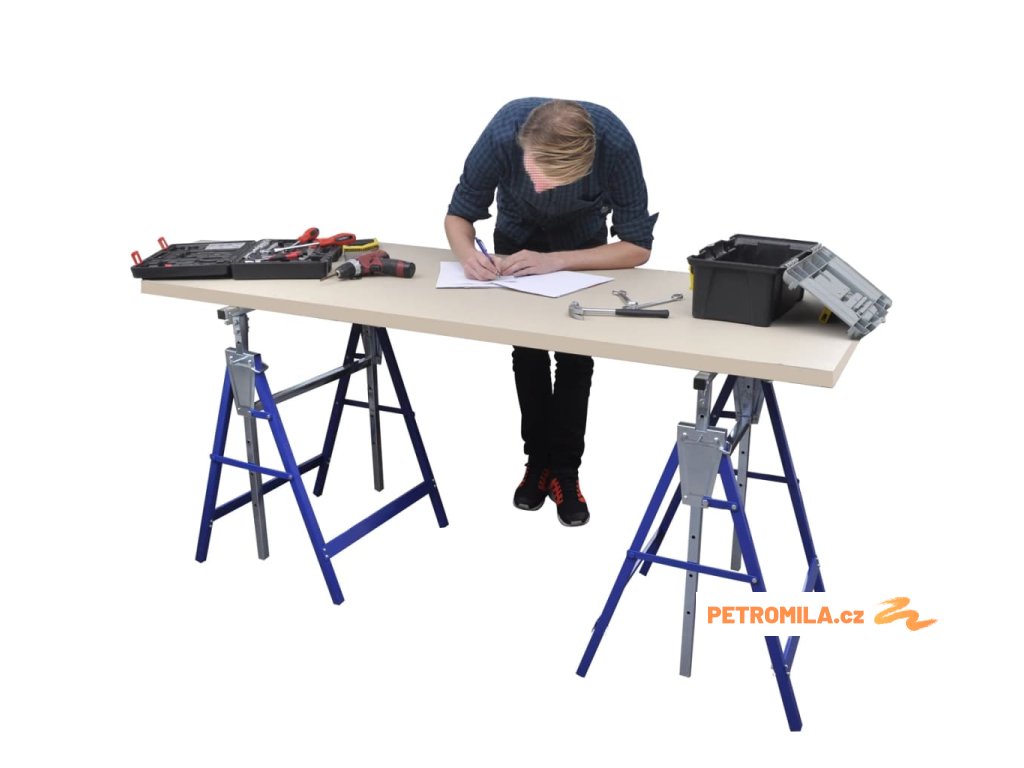 Rámy těchto 2 lešenářských koz jsou výškově nastavitelné od 81 až do 130 cm. Mají pevnou ocelovou konstrukci a bezpečnostní pojistku s protiskluzovou ochranou pro vaši bezpečnost. Lešení je přenosné a dá se rychle složit. Můžete pracovat bezpečně s připojenými příčnými výztuhami. Náklon lešení zabrání pádu na místo, na kterém pracujete. Tato lešení mají nosnost až 150 kg. Pozor, nestupujte na kozy.
