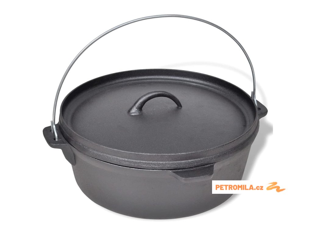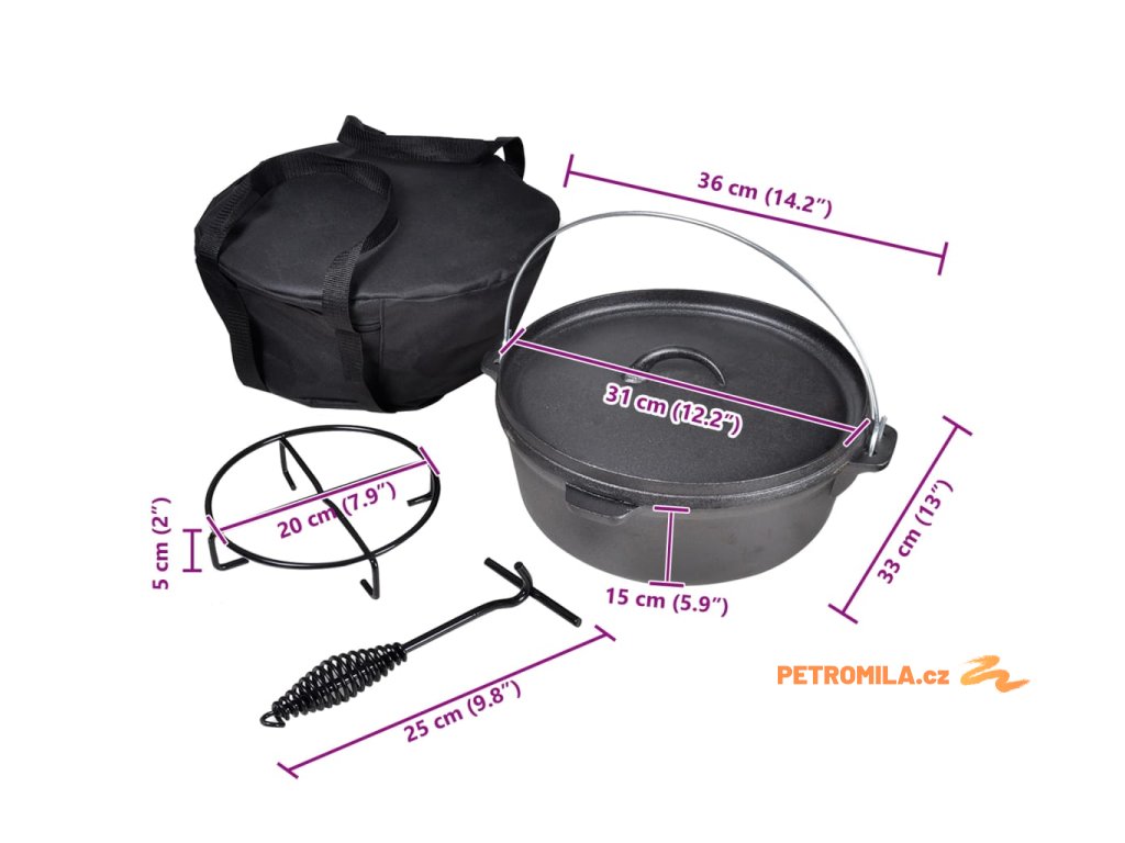Tento litinový Dutch Oven hrnec s kapacitou 5,6 l je ideální pro začátečníky i experty. Hrnec může být použit pro výrobu husté polévky , omáčky, pečenky , atd. Tento litinový Dutch Oven hrnec je dodáván s černým sáčkem , krytem s zvýšenými okraji , víkem zvedáku a stojanu. Je vyroben z vysoce kvalitních materiálů , takže hrnec je velmi odolný . Součástí balení je černá taška pro přenášení a udržovat hrnec čistý během přepravy. Tato litinový hrnec je univerzální nástroj pro použití doma nebo v přírodě a je ideální pro vaření, pečení a smažení .