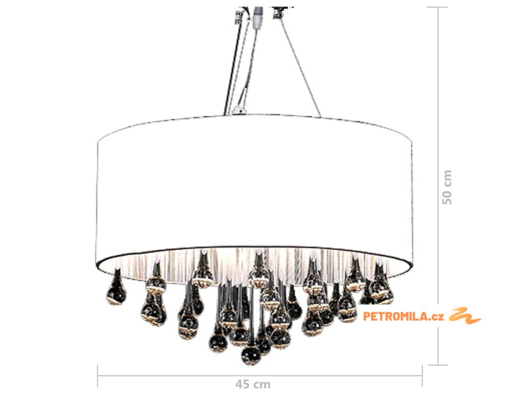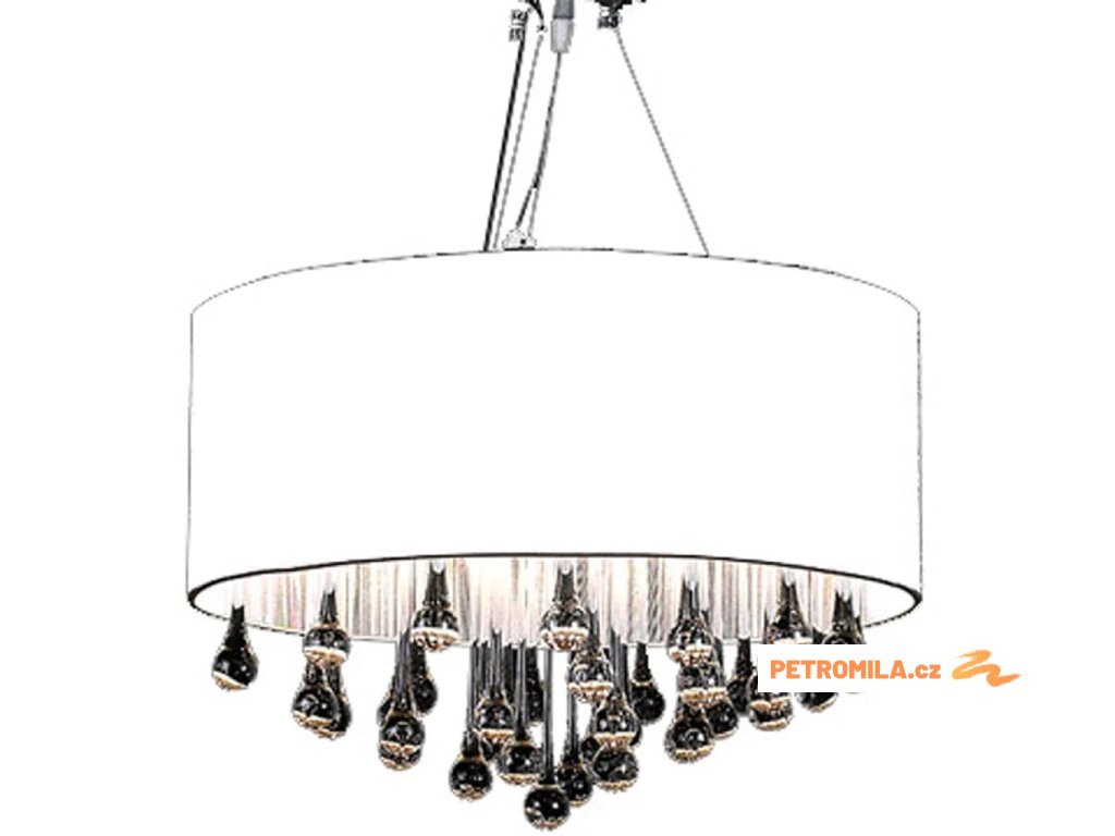 Lustr má kovový pochromovaný plášť a je potažený průsvitným bílým stínidlem z příze. Stylové ověsky mají královský křišťálový design. Vysoce kvalitní bezbarvé sklo je neuvěřitelné jasné a poskytuje vysoký jas (i z jiných zdrojů světla), který hraje všemi barvami spektra.