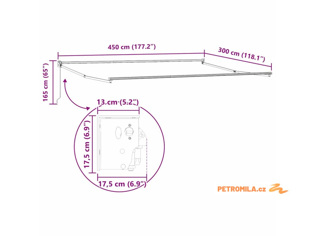 - Celkové rozměry: 450 x 300 x 165 cm (D x Š x V)