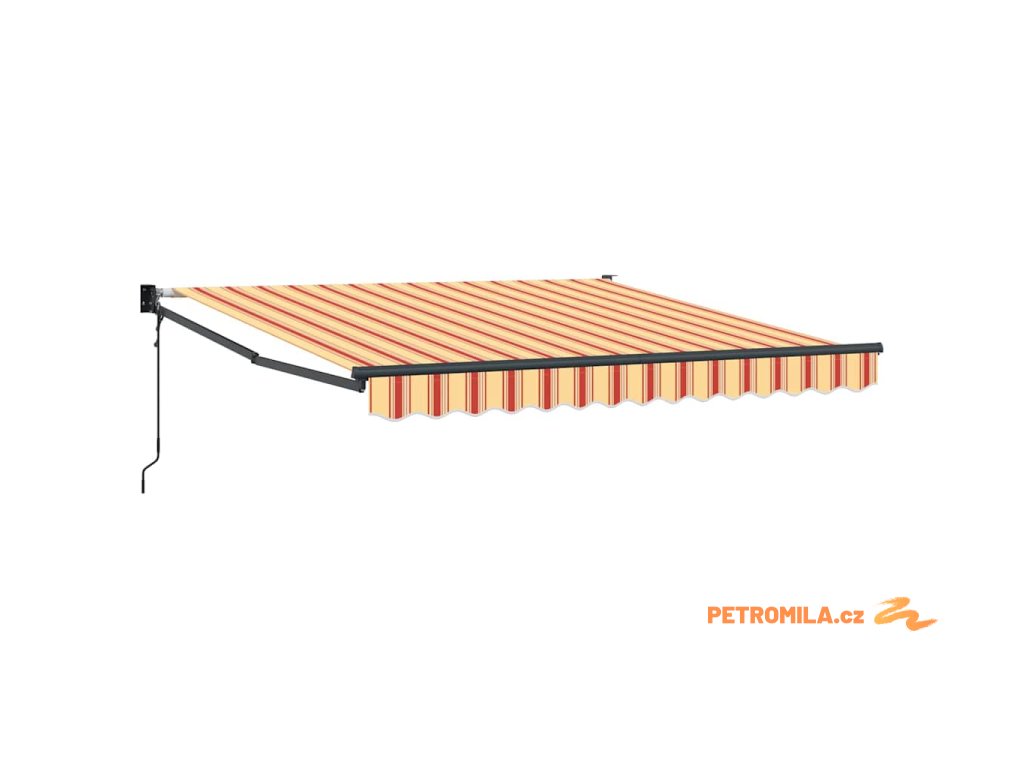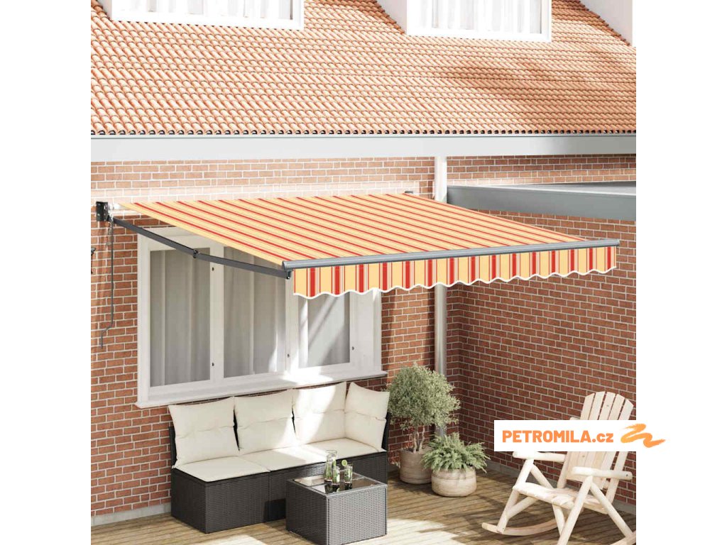 Výsuvná markýza dodává šmrnc každému venkovnímu prostoru, spojuje styl a funkčnost pro terasu nebo balkon. S moderním obdélníkovým tvarem a živými pruhovanými vzory ve žluté a oranžové barvě vytváří pozitivní a vítající atmosféru, perfektní pro letní odpočinek.