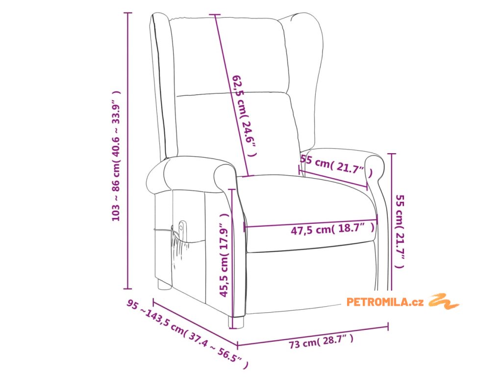 - Rozměry při poloze vsedě: 73 x 95 x 103 cm (Š x H x V)