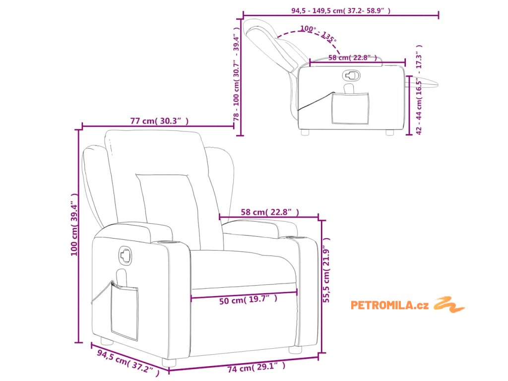 - Rozměry vsedě: 77 x 94,5 x 100 cm (Š x H x V)