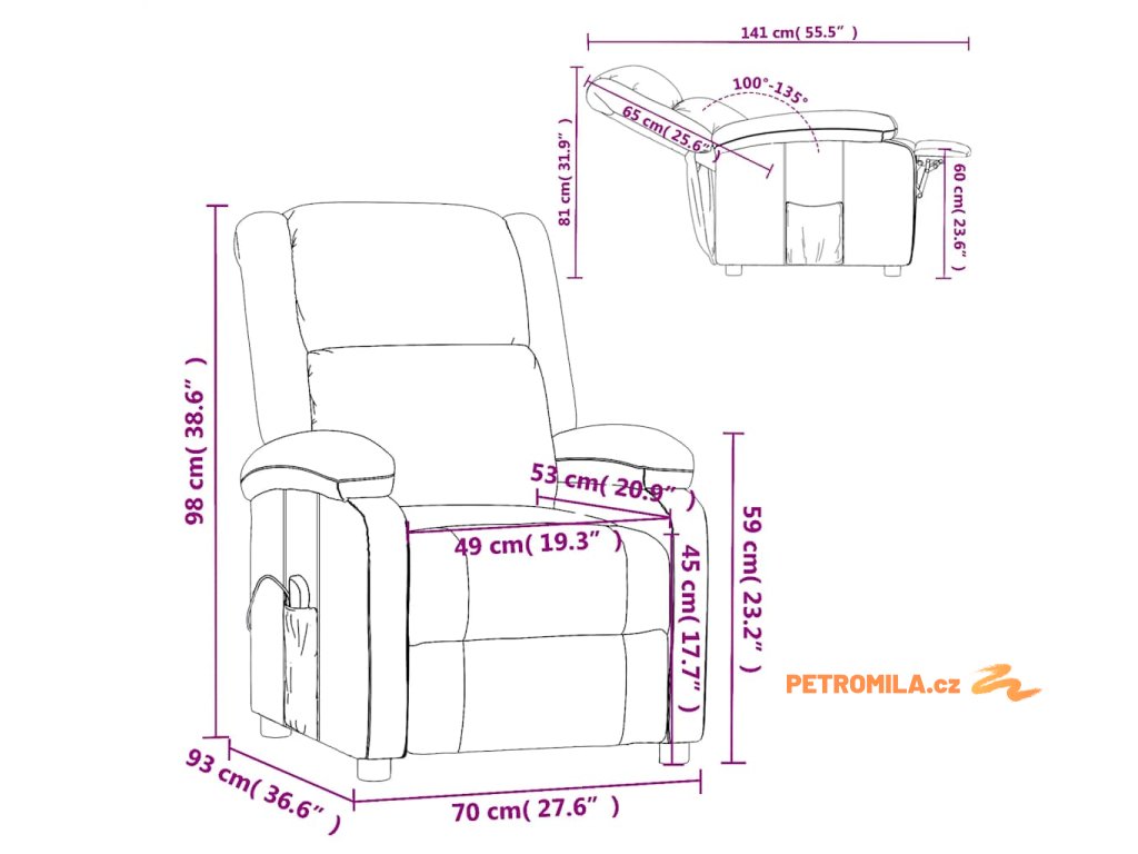 - Rozměry při poloze vsedě: 70 x 93 x 98 cm (Š x H x V)