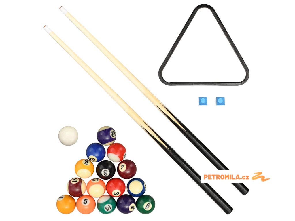 Hrací set obsahuje kulečníkový stůl, 1 trojúhelník, 16 koulí, 2 tága a také 2 křídy.