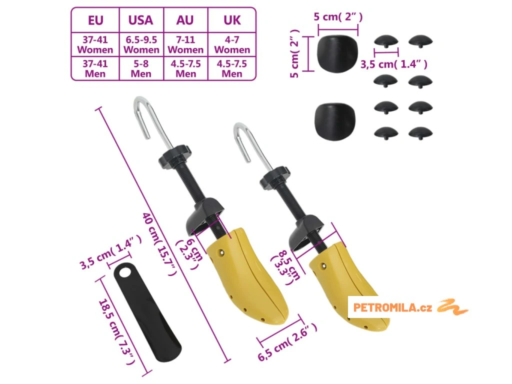 - Nastavitelné 4 způsoby: Otáčením knoflíku a háčku ve směru hodinových ručiček můžete boty prodloužit a rozšířit. Součástí balení je 8 zátek na vbočený palec a 2 výškové podložky, které pomáhají při roztahování konkrétních oblastí a zvyšování nártu boty. Pro získání pohodlné a dobře padnoucí obuvi se doporučuje nechat je v botě 24 až 48 hodin!