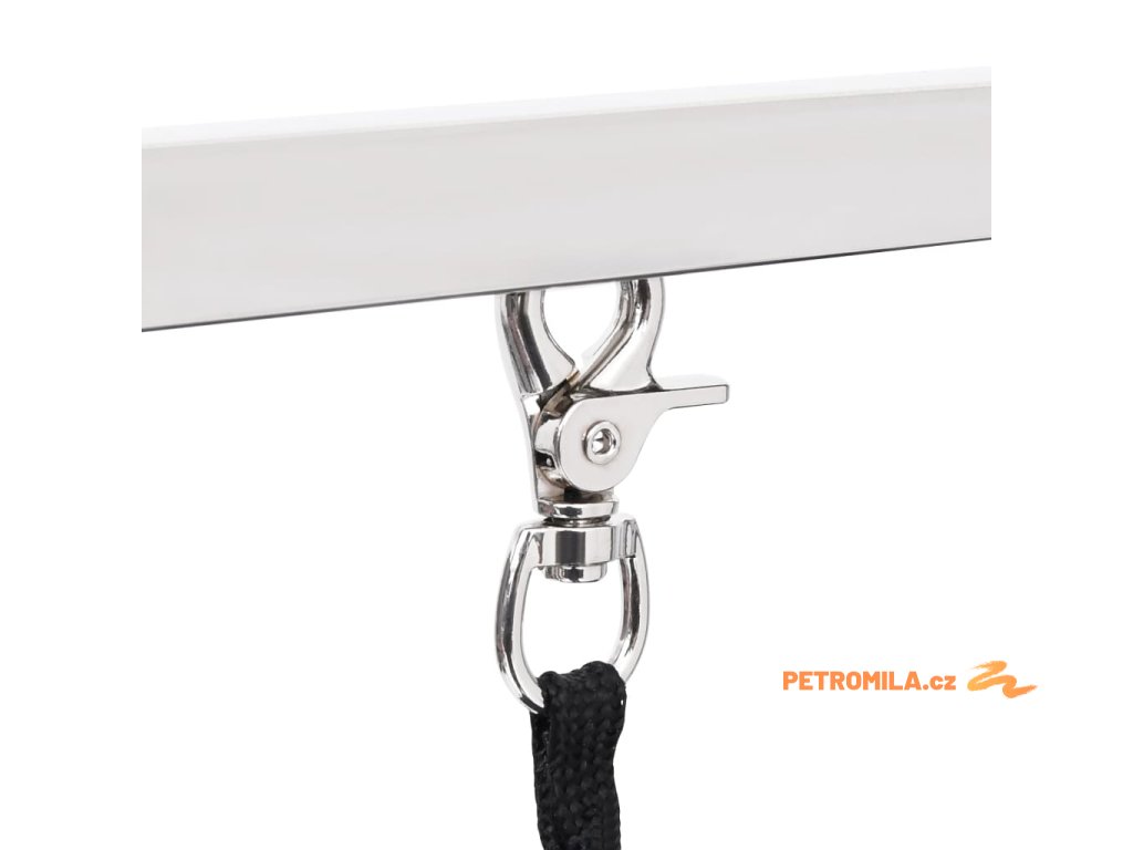 Stůl pro stříhání domácích mazlíčků podepírají ocelové nohy, takže je stabilní a robustní. Vaši miláčci mohou pohodlně stát na velké protiskluzové stolní desce. Zastřihovací rameno z nerezové oceli je výškově nastavitelné, dá se tedy přizpůsobit vám a velikosti vašeho domácího mazlíčka. Stůl je skládací, což je ideální pro mobilní psí kadeřníky i pro domácí použití, protože se snadno převáží a skladuje. Pod stolní deskou se nachází koš, kam můžete ukládat každodenní potřeby vašeho zvířete. Zaoblené rohy stolu navíc chrání před zraněním.