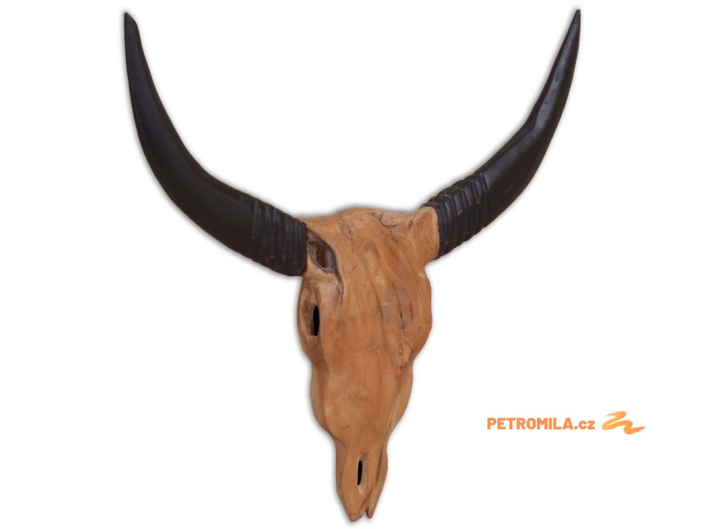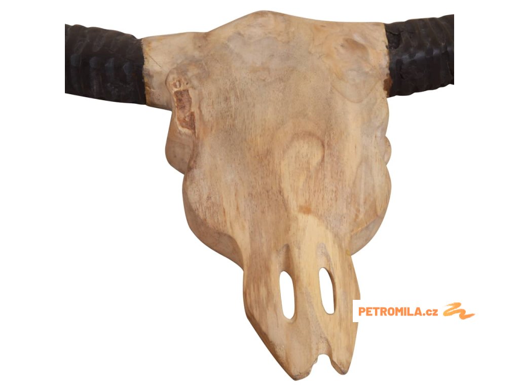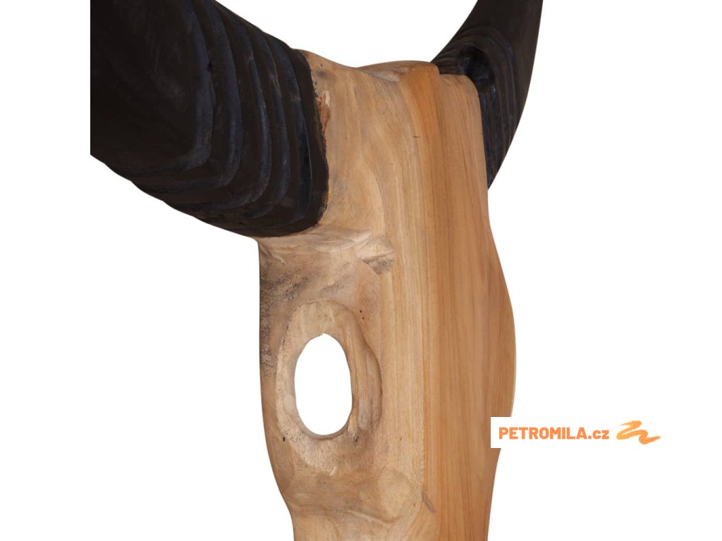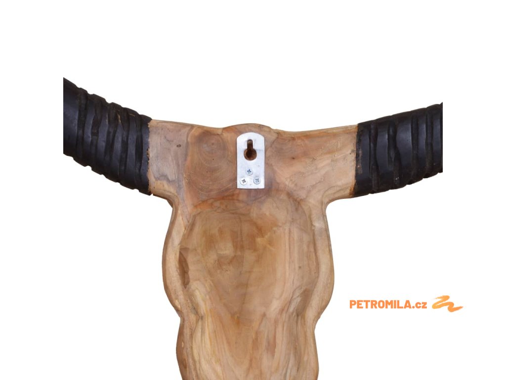 Dekorace má tvar stylizované býčí lebky včetně rohů. Byla ručně vyrobena z teaku, což jí propůjčuje jedinečný rustikální vzhled.
