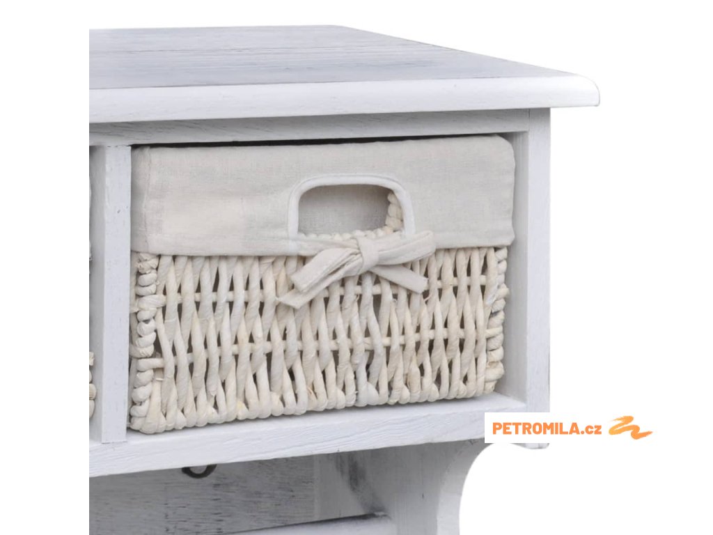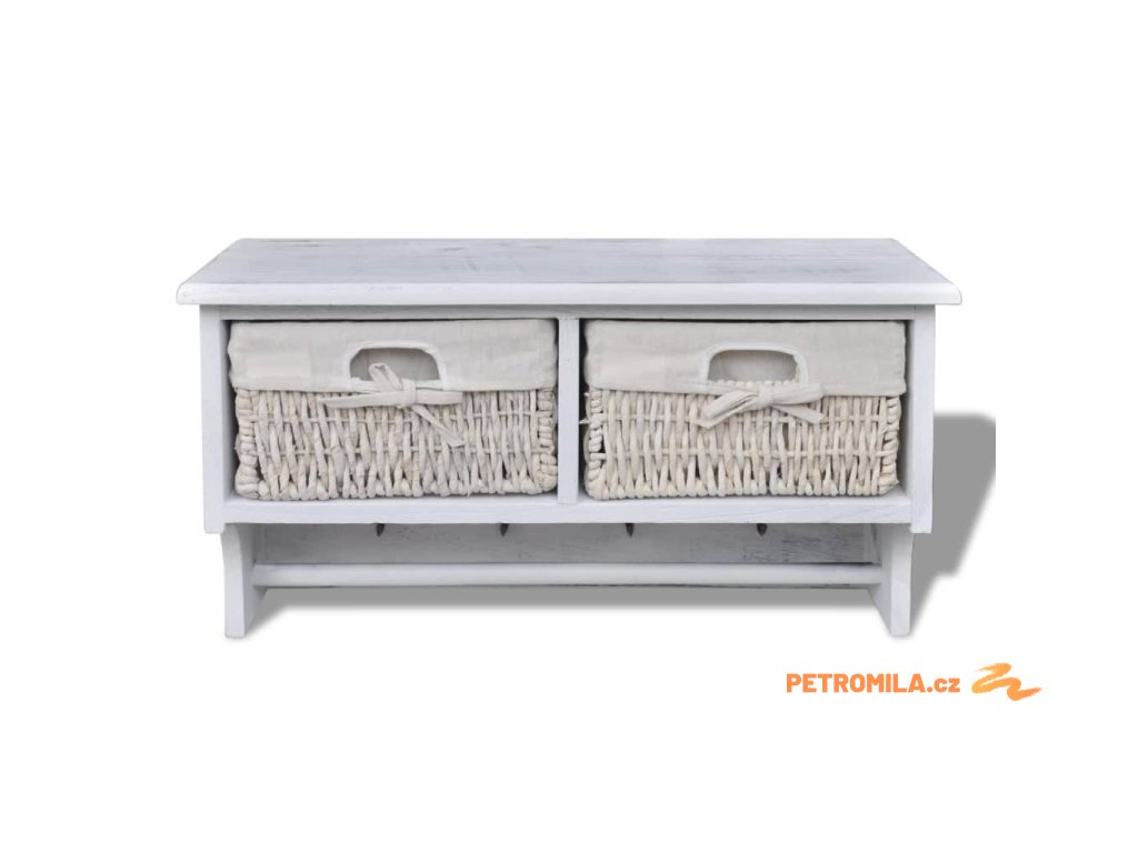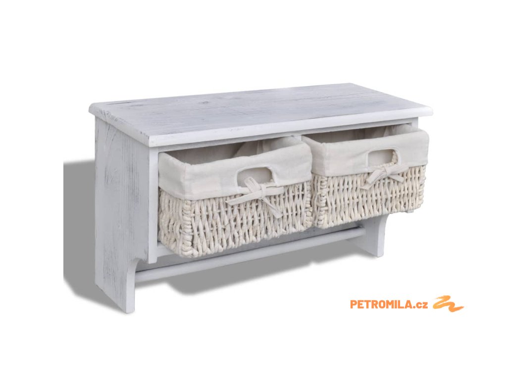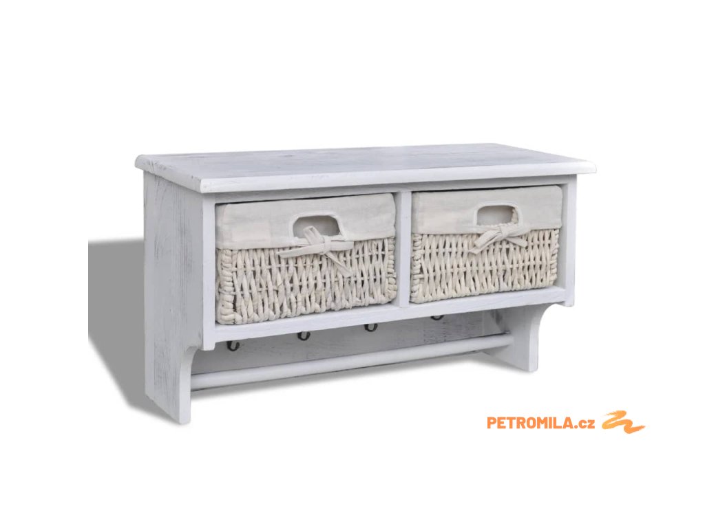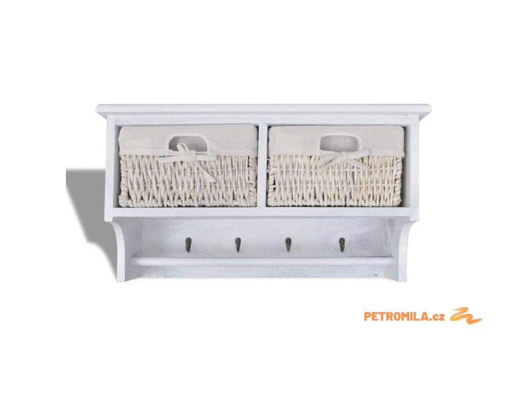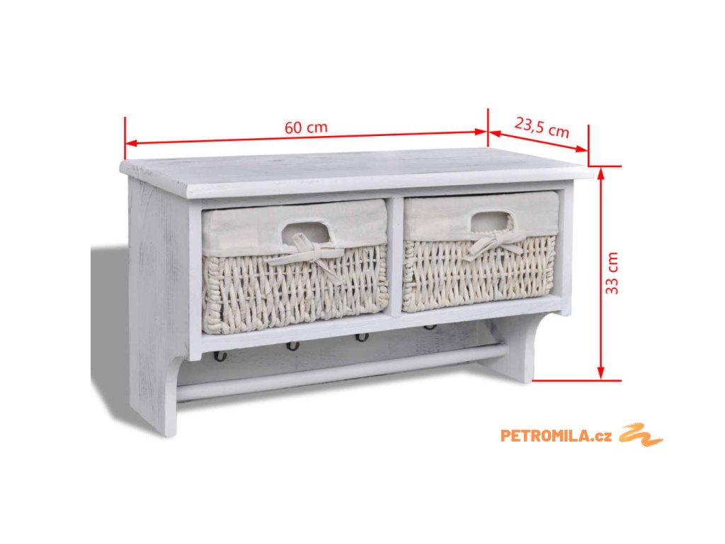 Police má dva proutěné košíky, které se vyznačují velkou robustností. Čtyři kovové háčky vám nabízí prostor navíc, kde můžete zavěšovat věci, jako jsou klíče, klobouky a rukavice, a vodorovnou tyč, která je perfektní na věšení ručníků nebo jiného prádla. Ujistěte se prosím, že police bude upevněna ve vhodné výšce.